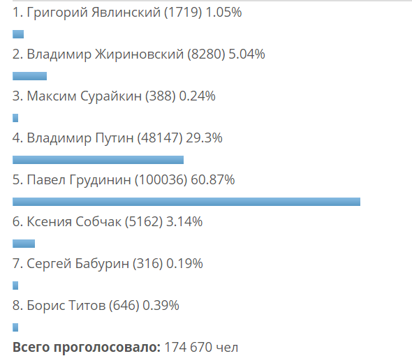 На портале http://president-rf.ru/page/rejting-kandidatov проголосовало на настоящий момент 174 670 чел.