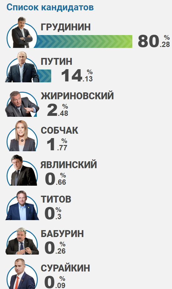 Если сравнивать рейтинг основных кандидатов данный официальными социологами и пользователями Интернета, то рейтинг Павла Грудинина в официальной статистике в 10 раз ниже, а рейтинг Владимира Путина в 3-4 раза выше, чем дают его пользователи Интернета. Конечно, пользователи Интернета - не весь срез общества, но сегодня это большая часть общества. При этом в Интернете проголосовало гораздо больше людей, чем смогли опросить социологи. Разумеется в реальном голосовании на избирательном участке результаты могут значительно отличаться от тех, что получены при голосовании в Интернете, но не в ДЕСЯТЬ ЖЕ РАЗ!!!