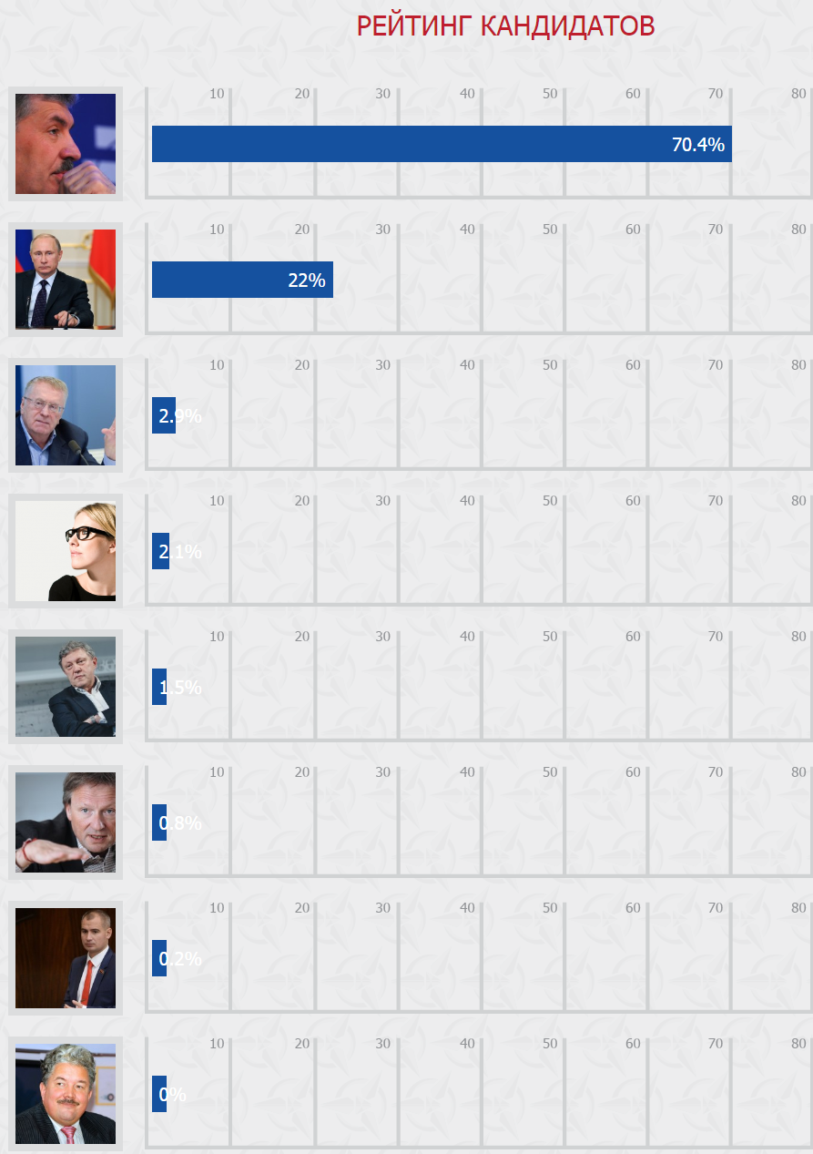 Если бы выборы проходили сейчас, 73 процента опрошенных отдали бы свои голоса за действующего президента Владимира Путина. Следом за ним в народном рейтинге находятся Владимир Жириновский (ЛДПР) и Павел Грудинин (КПРФ): их своим кандидатом считают по 6% россиян. На четвертом месте оказалась Ксения Собчак, однако ее поддерживают не более 1% респондентов. Далее в рейтинге расположились Григорий Явлинский и Борис Титов, которые набрали менее 1% голосов.