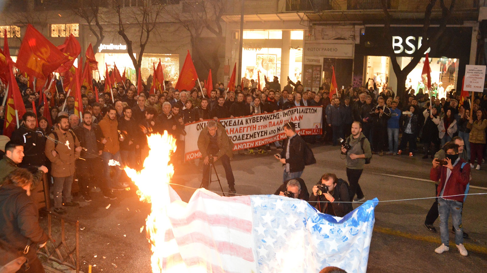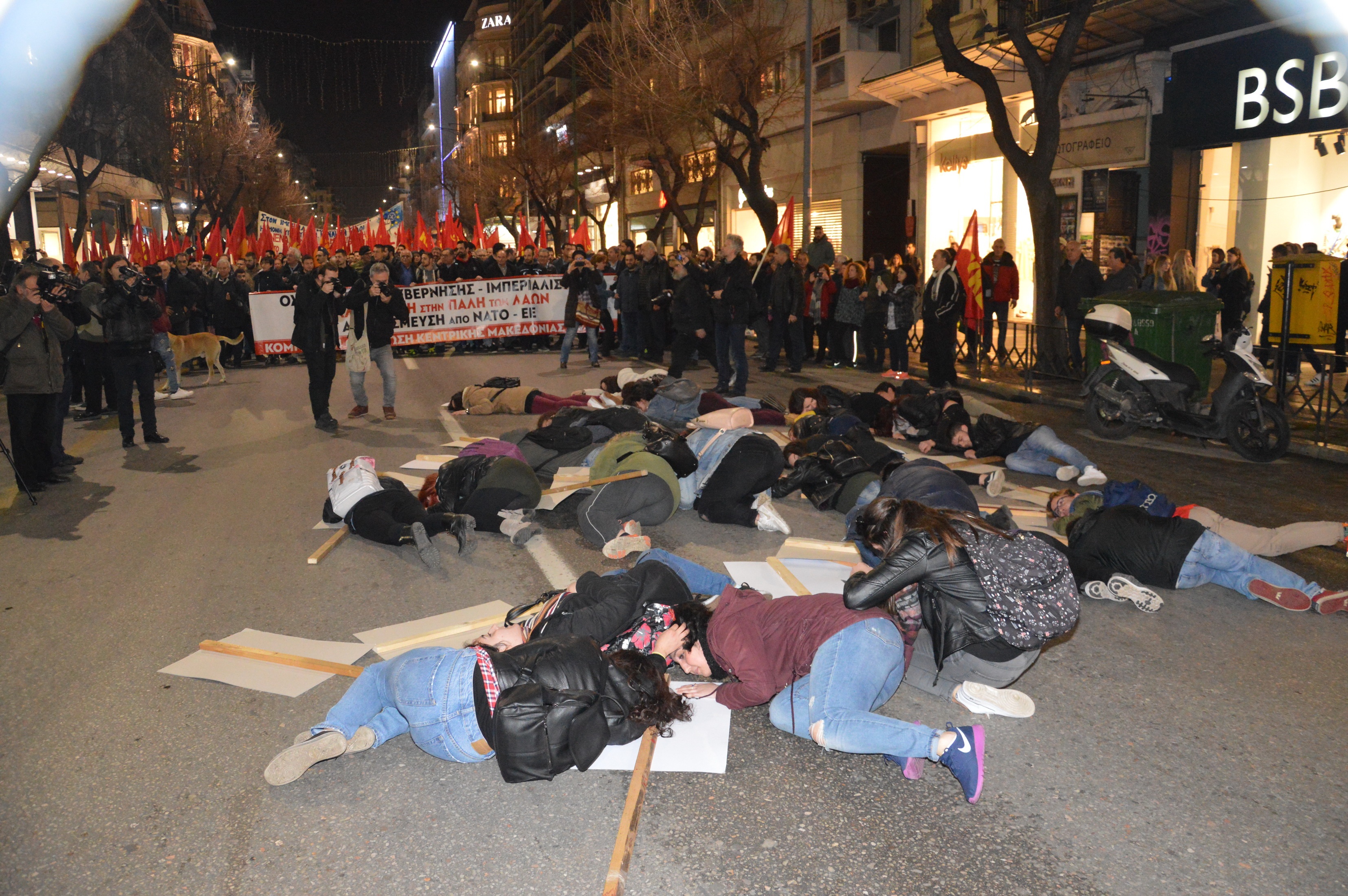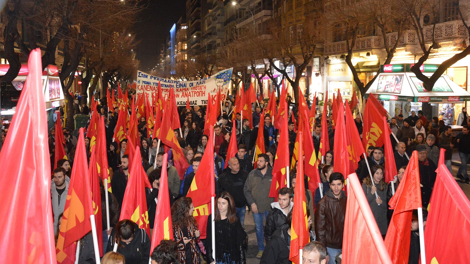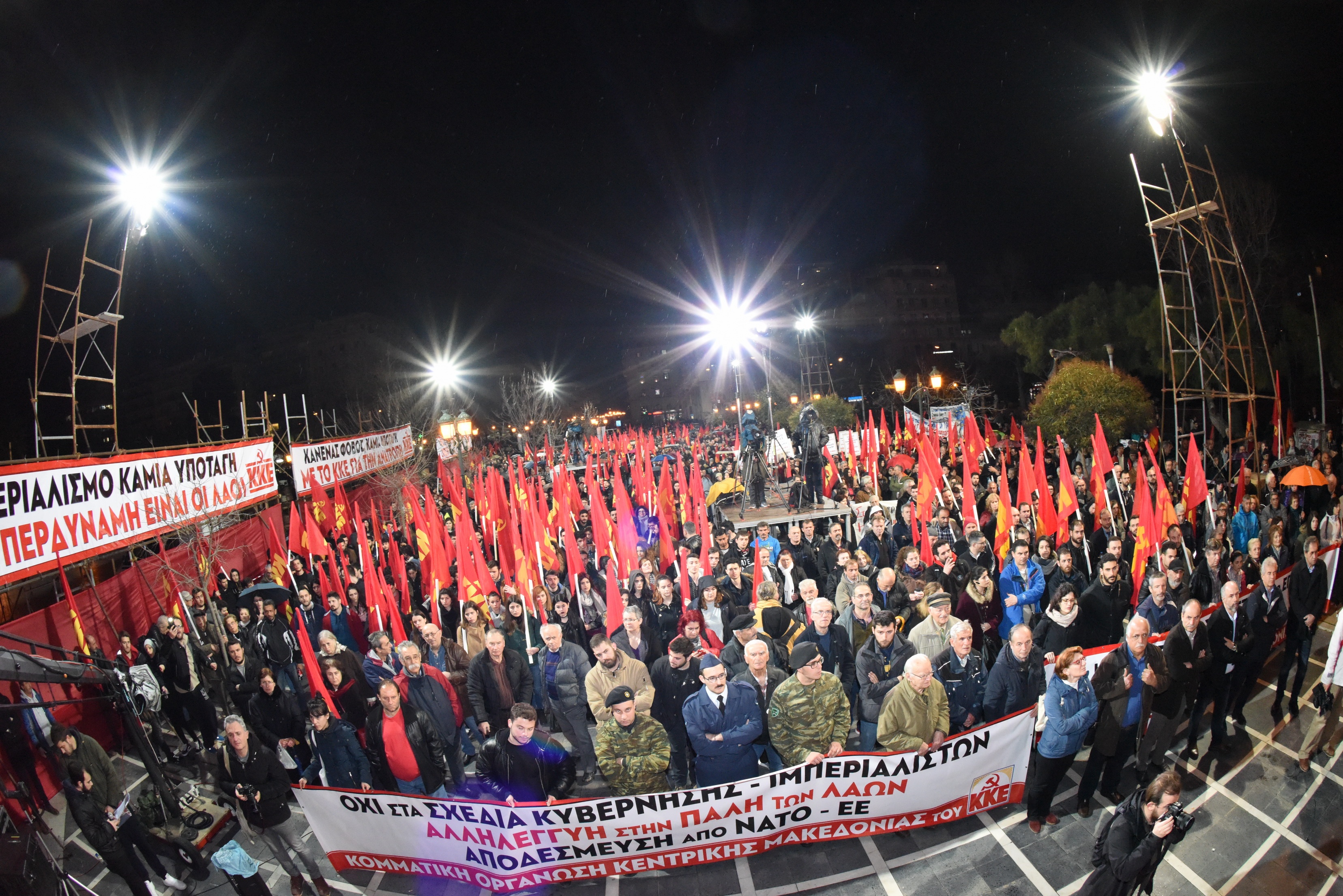После митинга состоялось массовое шествие к американскому консульству в Салониках. В ходе шествия тысячи митингующих, держа в руках баннеры и флаги КПГ, скандировали лозунги, обвиняющие империалистов: «Империалисты вновь делят землю, кровью народов чертят границы», а также лозунги, призывающие к сопротивлению и борьбе, такие как «Солидарность с борьбой народов против планов империалистов», «Никакого страха, никакого подчинения, с КПГ за свержение власти».