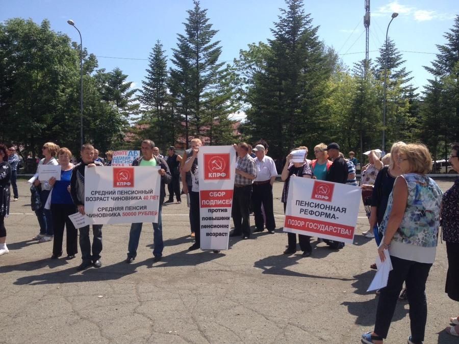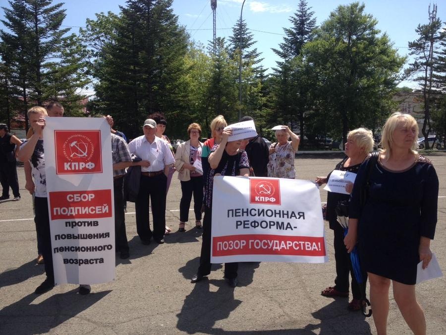 29 июня 2018 года на центральной площади в Надеждинском районе Приморского края совместно с профсоюзами коммунисты приняли участие в пикете против повышения пенсионного возраста в РФ.