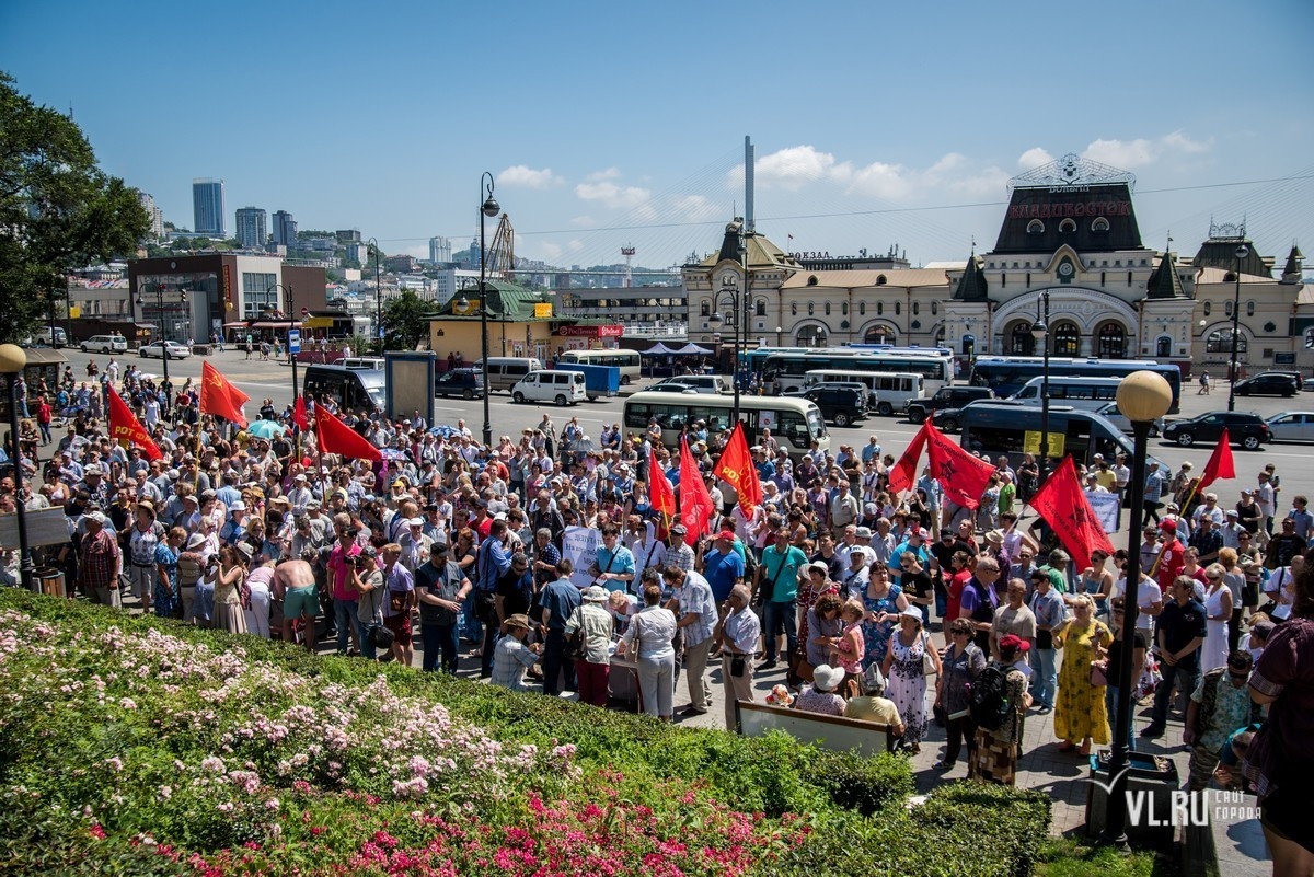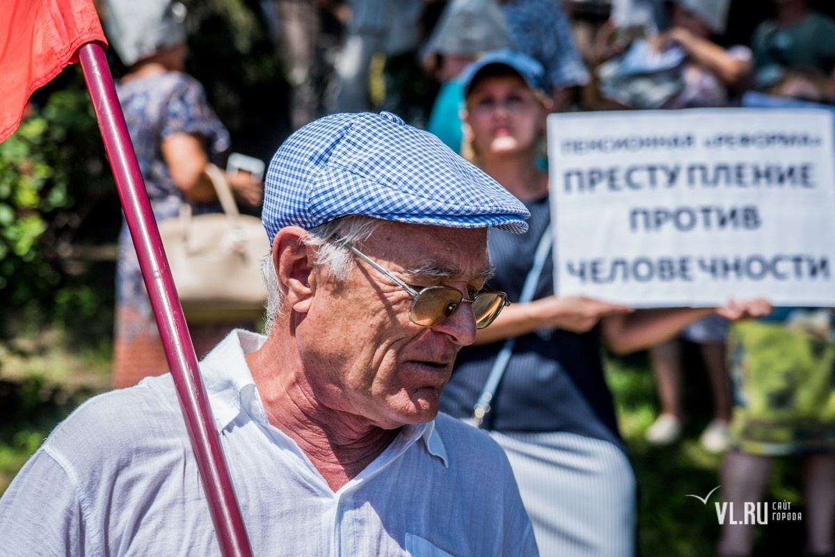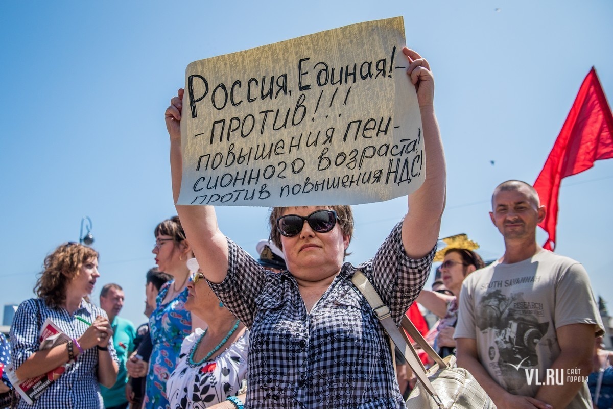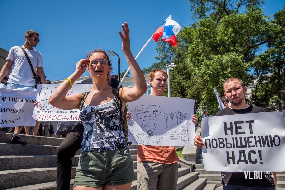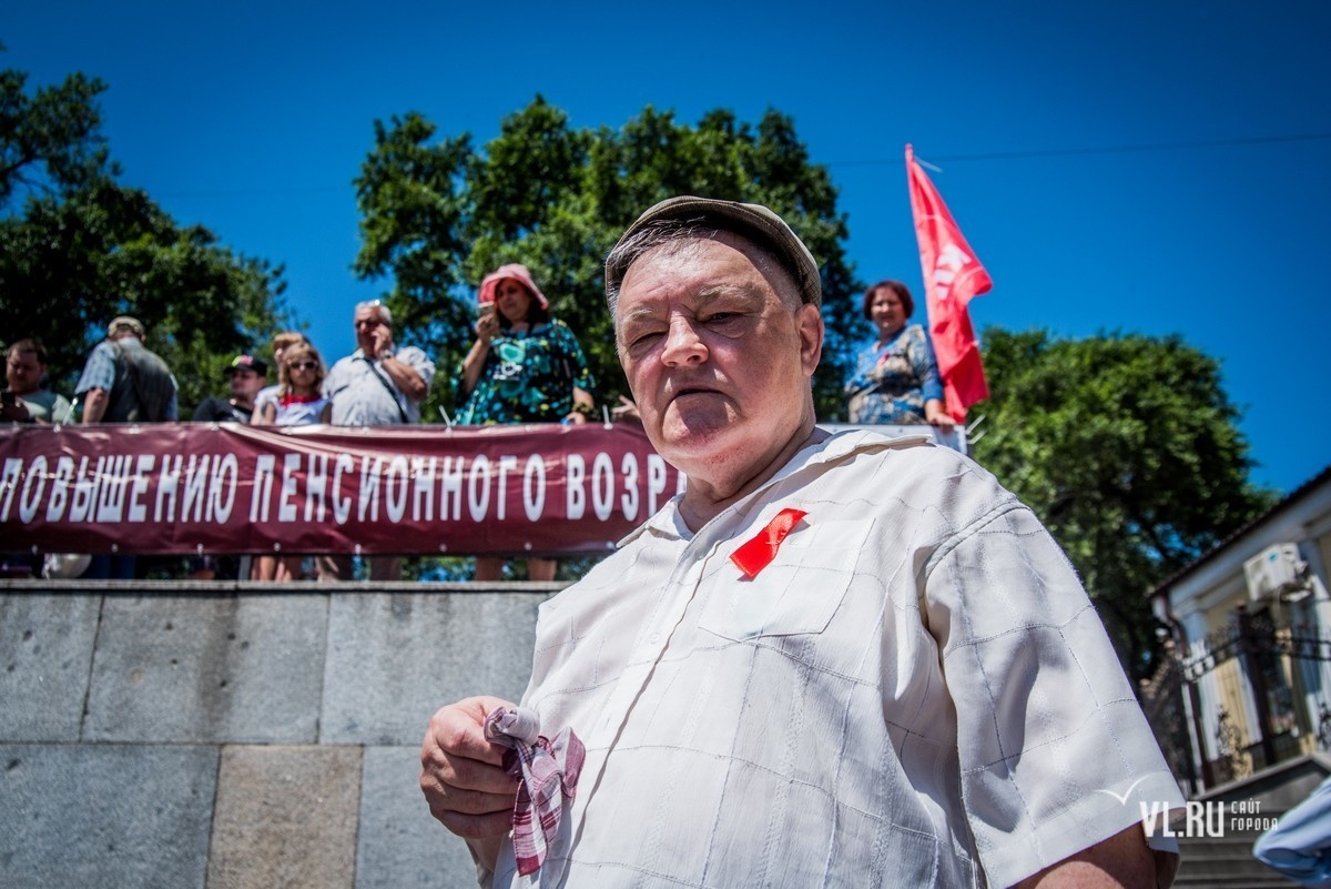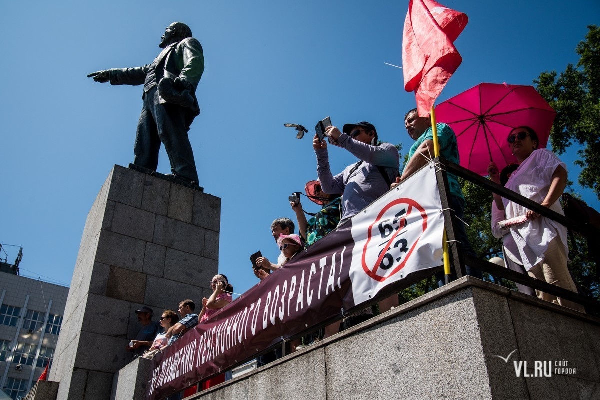 Возмущенные грядущим повышением пенсионного возраста, а также принятием закона о повышении НДС до 20% владивостокцы вышли на согласованную акцию протеста. Местом проведения митинга стала привокзальная площадь. У памятника Ленину главные организаторы – приморские коммунисты – под песню «Моя Родина – Советский Союз» развернули плакаты с лозунгами «Нет повышению пенсионного возраста», «"Денег нет". Наш ответ: "Уходите"», «Россия – единая! Против повышения пенсионного возраста», «Власть наглеет, а мы краснеем», «Вместе мы сила», «Реформа нужна МВФ и строевой элите США» и «Планы правительства загоняют нас в нищету». Всем, кто присоединился к акции протеста, раздавали листовки и красные ленточки. Кроме того, организаторы собирали подписи за приостановление пенсионной реформы.