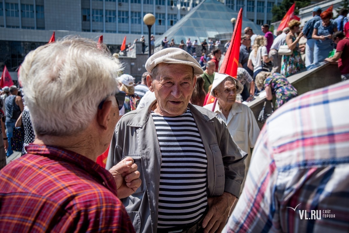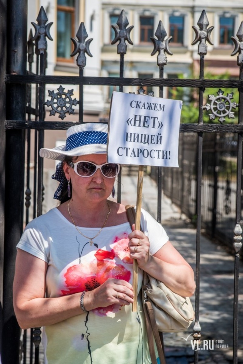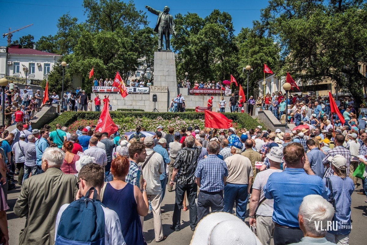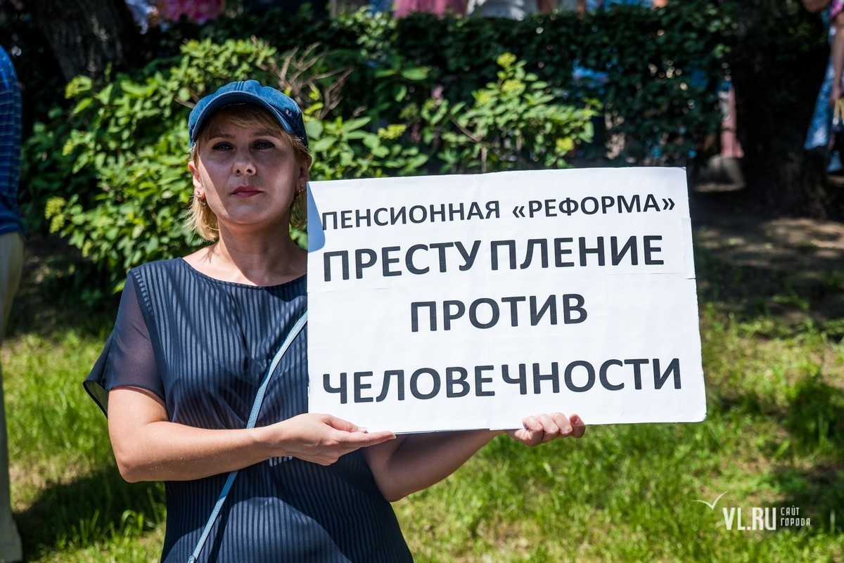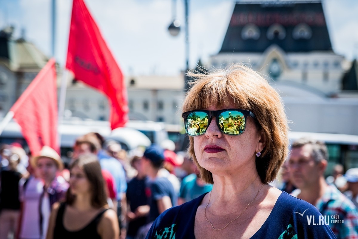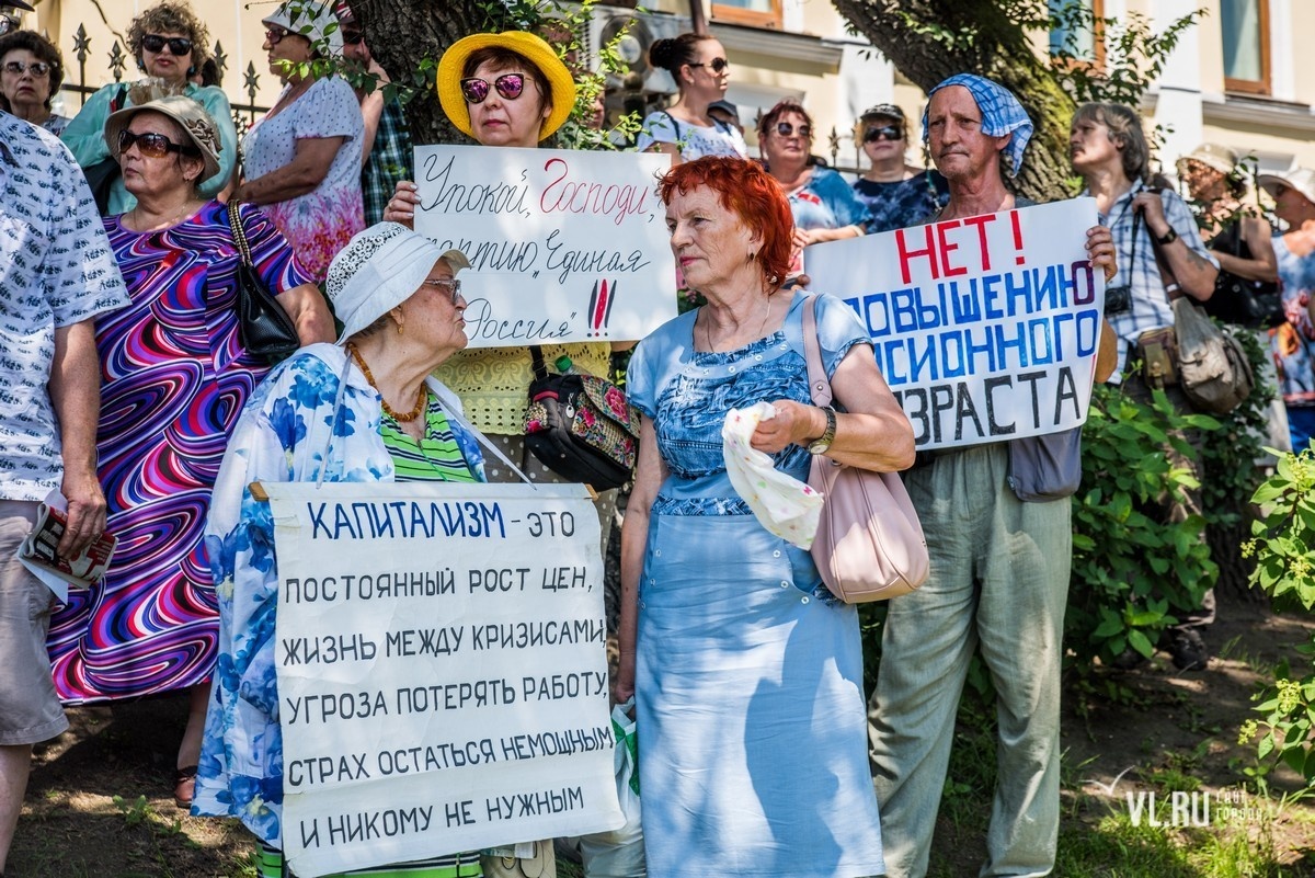 Возмущенные грядущим повышением пенсионного возраста, а также принятием закона о повышении НДС до 20% владивостокцы вышли на согласованную акцию протеста. Местом проведения митинга стала привокзальная площадь. У памятника Ленину главные организаторы – приморские коммунисты – под песню «Моя Родина – Советский Союз» развернули плакаты с лозунгами «Нет повышению пенсионного возраста», «"Денег нет". Наш ответ: "Уходите"», «Россия – единая! Против повышения пенсионного возраста», «Власть наглеет, а мы краснеем», «Вместе мы сила», «Реформа нужна МВФ и строевой элите США» и «Планы правительства загоняют нас в нищету». Всем, кто присоединился к акции протеста, раздавали листовки и красные ленточки. Кроме того, организаторы собирали подписи за приостановление пенсионной реформы.
