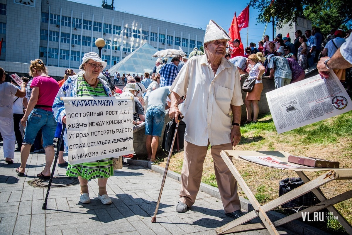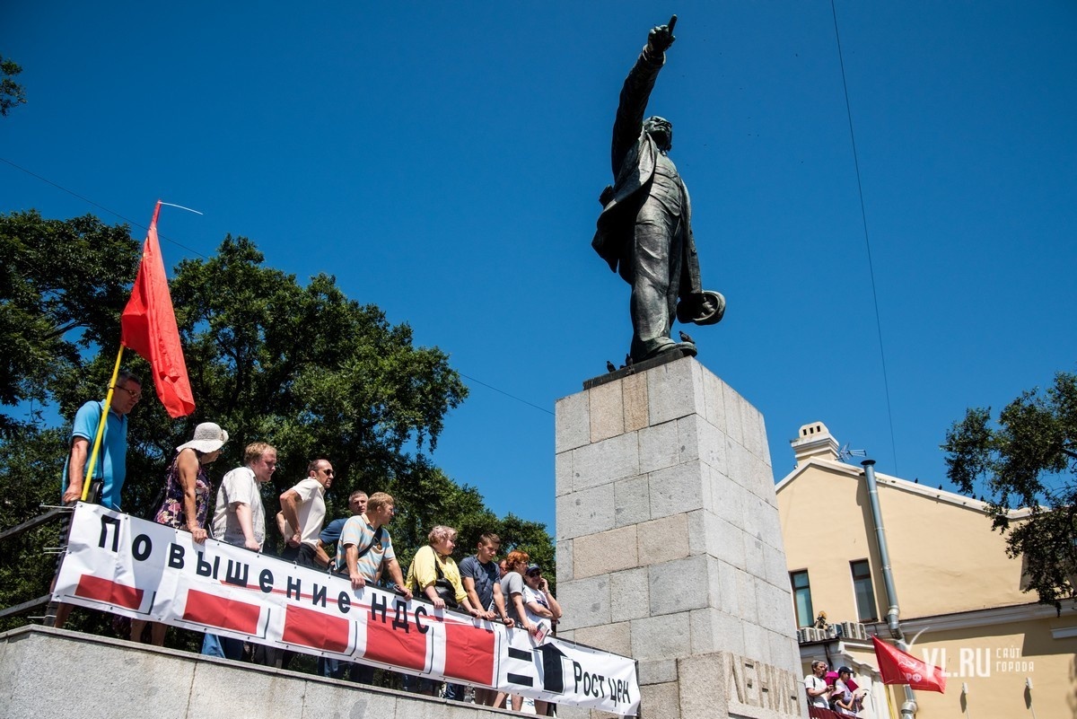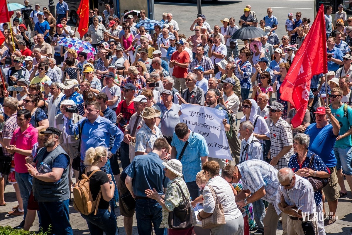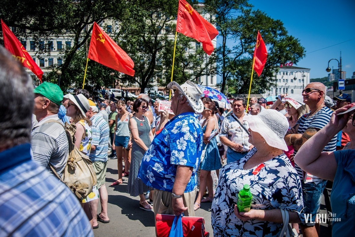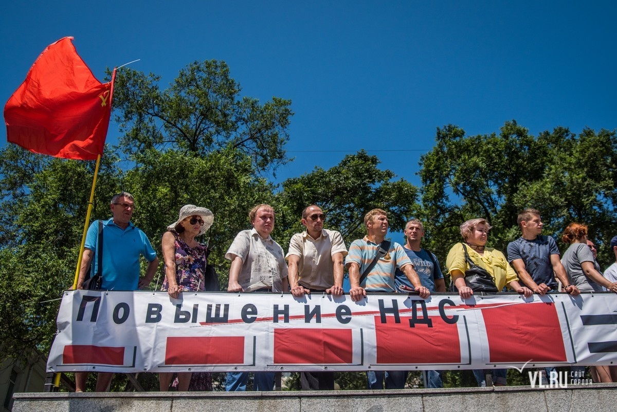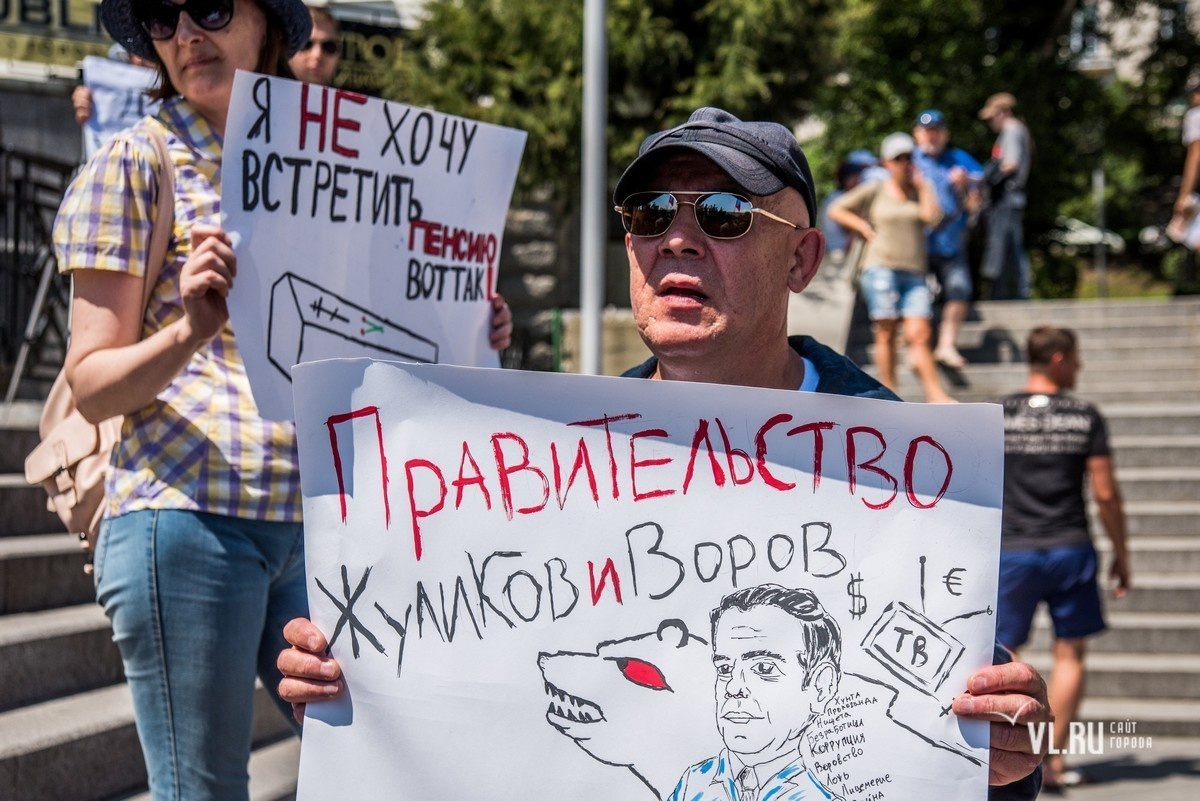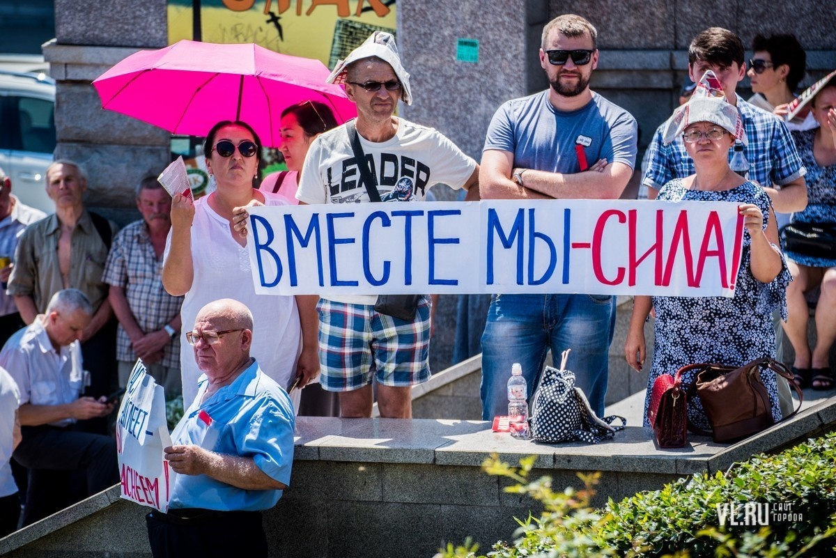 Возмущенные грядущим повышением пенсионного возраста, а также принятием закона о повышении НДС до 20% владивостокцы вышли на согласованную акцию протеста. Местом проведения митинга стала привокзальная площадь. У памятника Ленину главные организаторы – приморские коммунисты – под песню «Моя Родина – Советский Союз» развернули плакаты с лозунгами «Нет повышению пенсионного возраста», «"Денег нет". Наш ответ: "Уходите"», «Россия – единая! Против повышения пенсионного возраста», «Власть наглеет, а мы краснеем», «Вместе мы сила», «Реформа нужна МВФ и строевой элите США» и «Планы правительства загоняют нас в нищету». Всем, кто присоединился к акции протеста, раздавали листовки и красные ленточки. Кроме того, организаторы собирали подписи за приостановление пенсионной реформы.