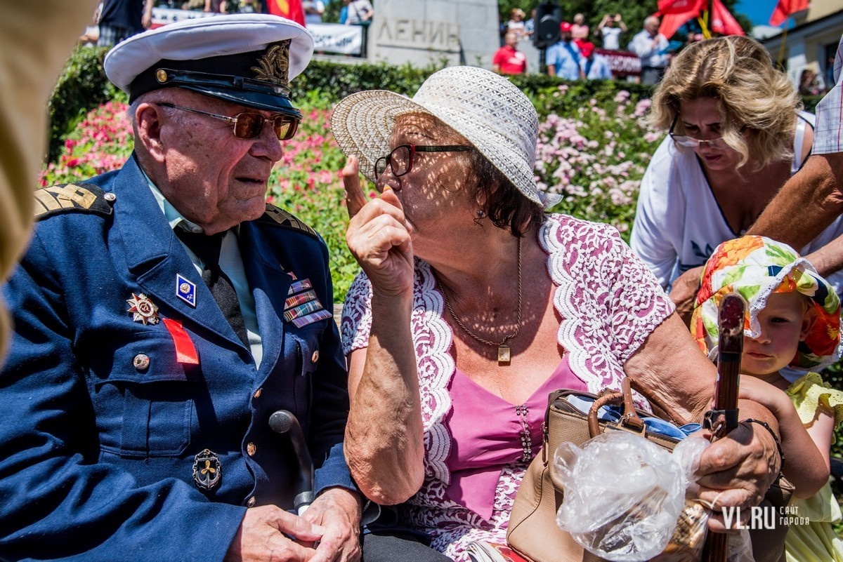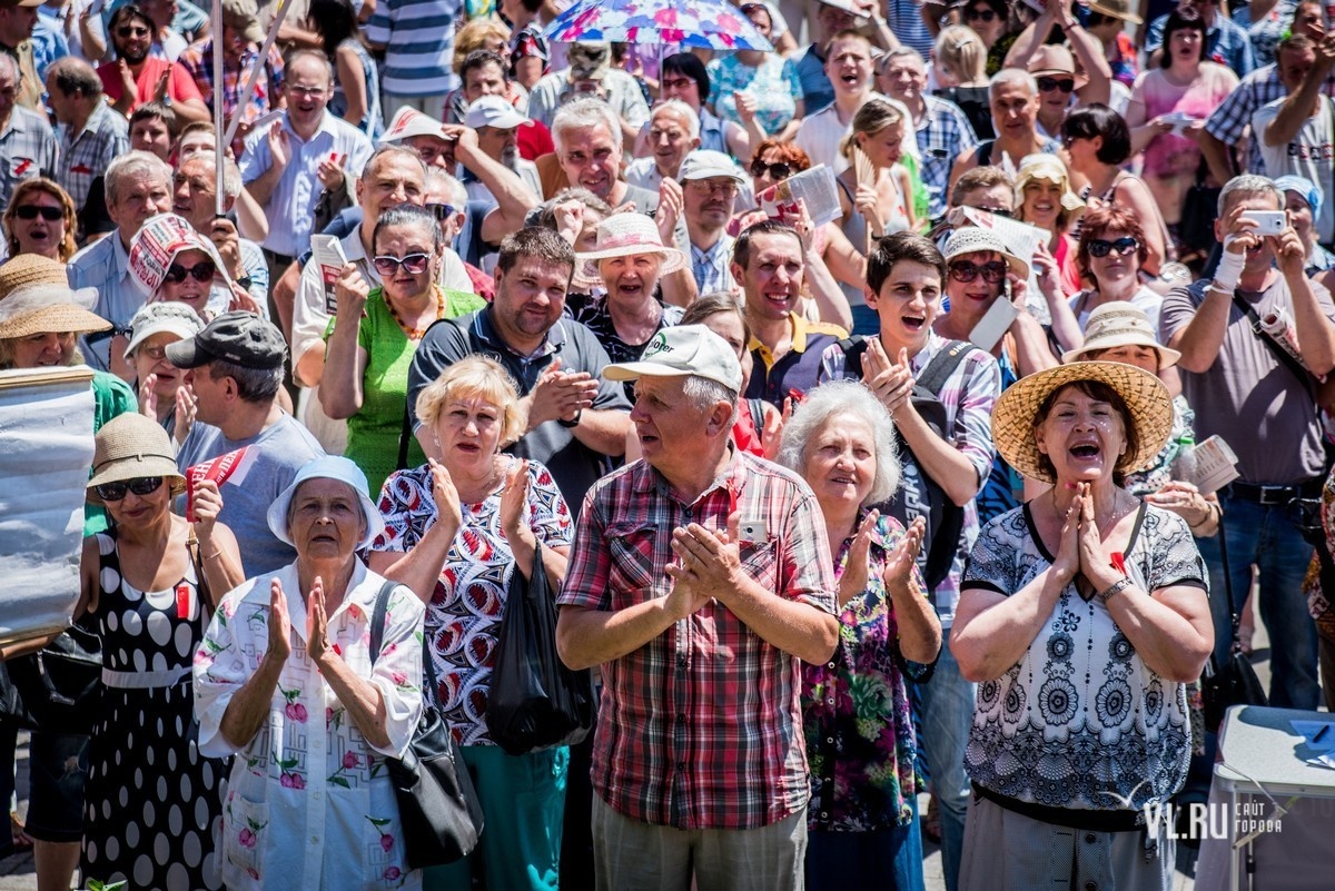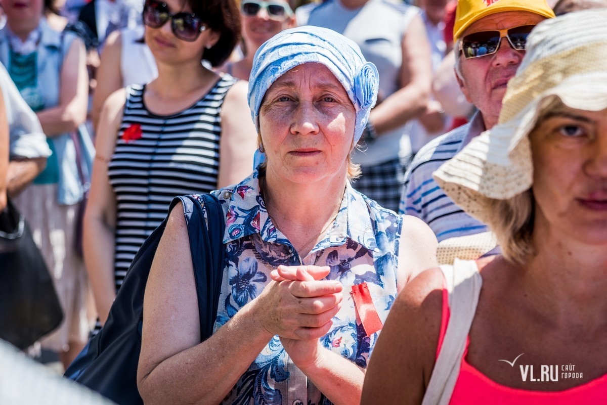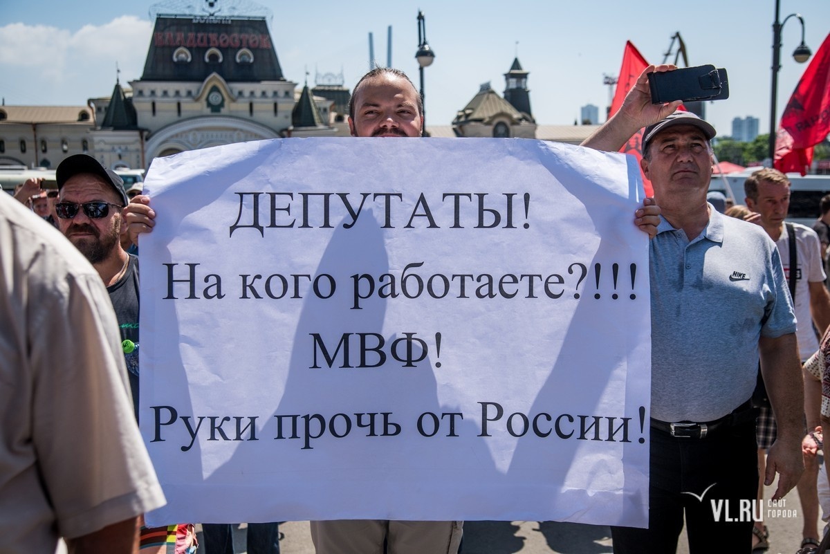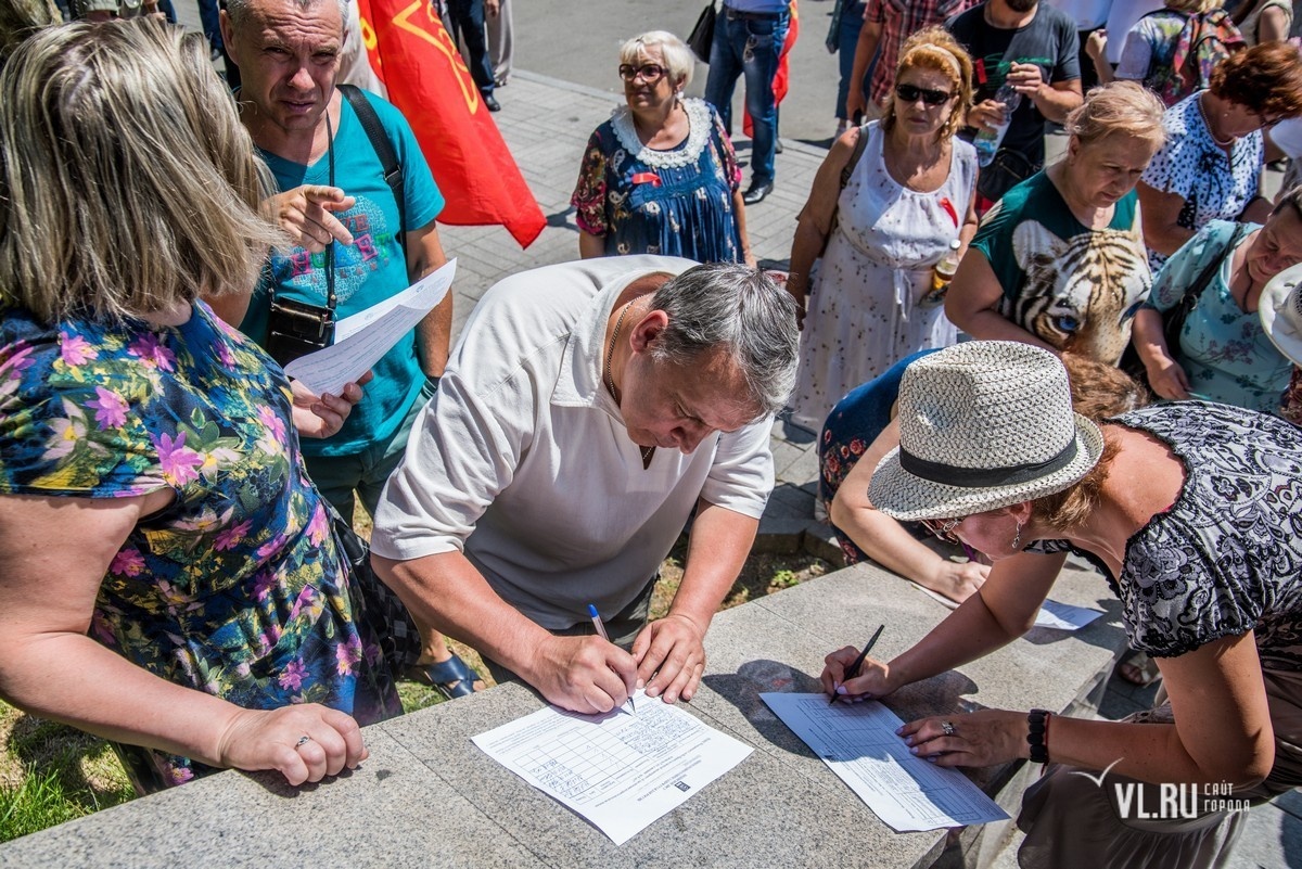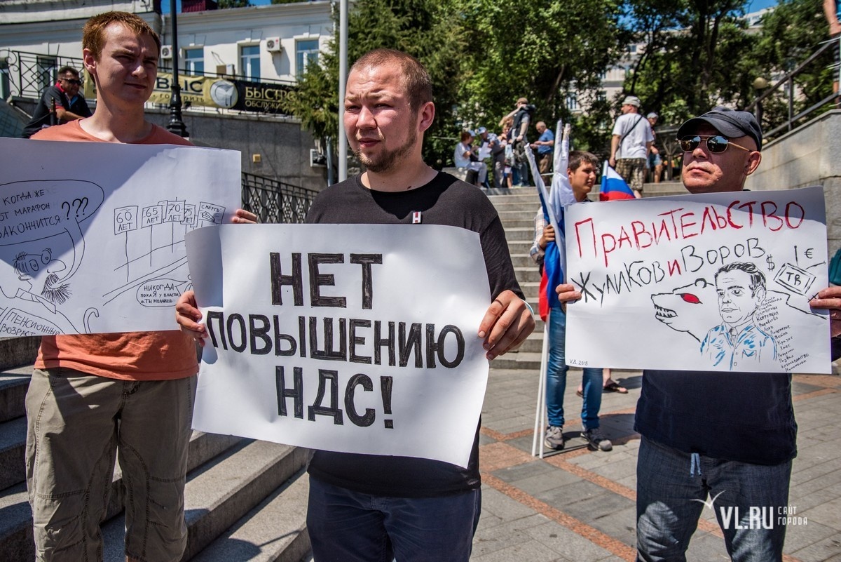 Возмущенные грядущим повышением пенсионного возраста, а также принятием закона о повышении НДС до 20% владивостокцы вышли на согласованную акцию протеста. Местом проведения митинга стала привокзальная площадь. У памятника Ленину главные организаторы – приморские коммунисты – под песню «Моя Родина – Советский Союз» развернули плакаты с лозунгами «Нет повышению пенсионного возраста», «"Денег нет". Наш ответ: "Уходите"», «Россия – единая! Против повышения пенсионного возраста», «Власть наглеет, а мы краснеем», «Вместе мы сила», «Реформа нужна МВФ и строевой элите США» и «Планы правительства загоняют нас в нищету». Всем, кто присоединился к акции протеста, раздавали листовки и красные ленточки. Кроме того, организаторы собирали подписи за приостановление пенсионной реформы.