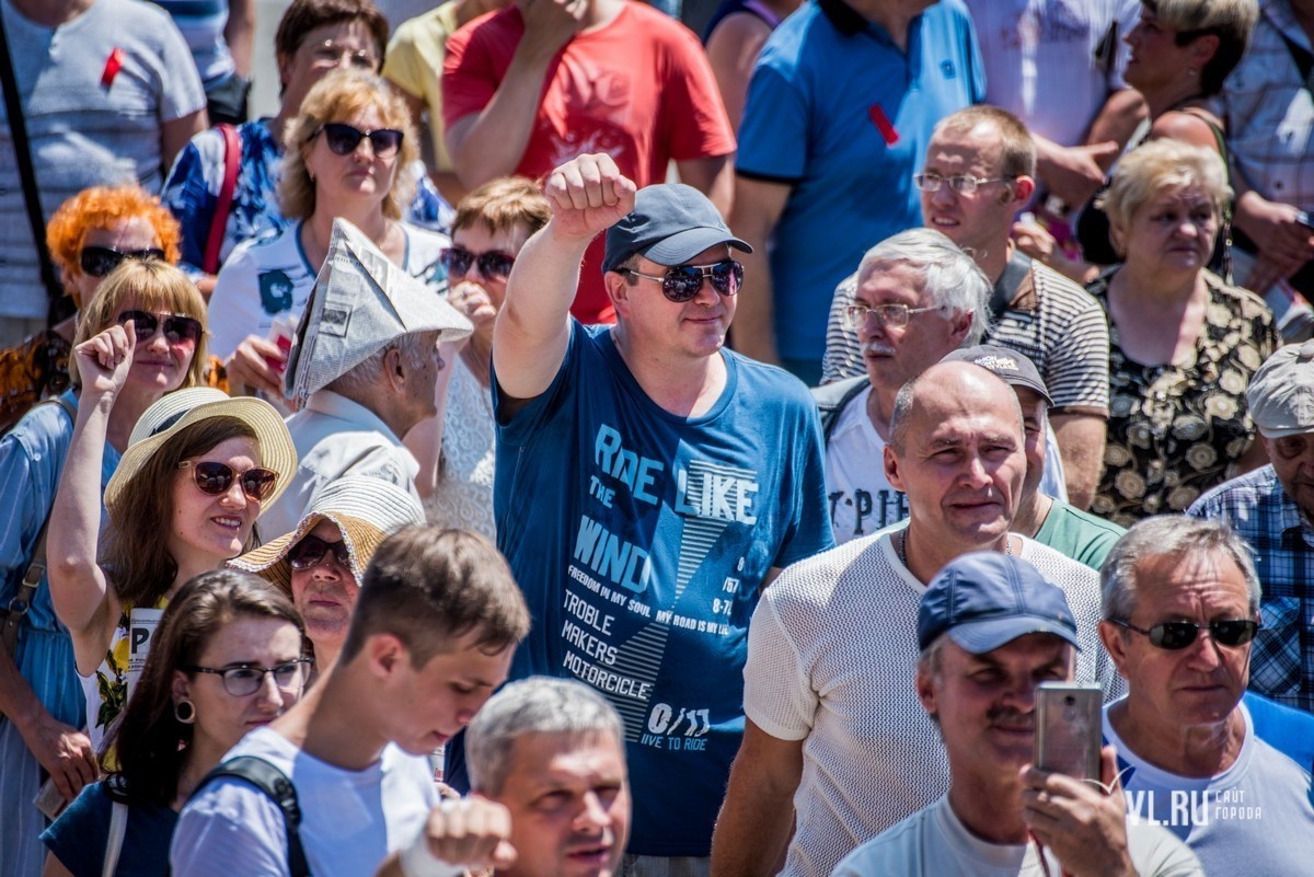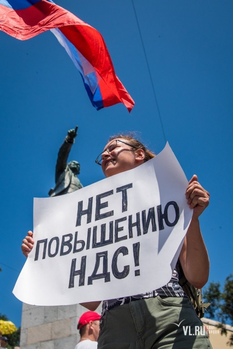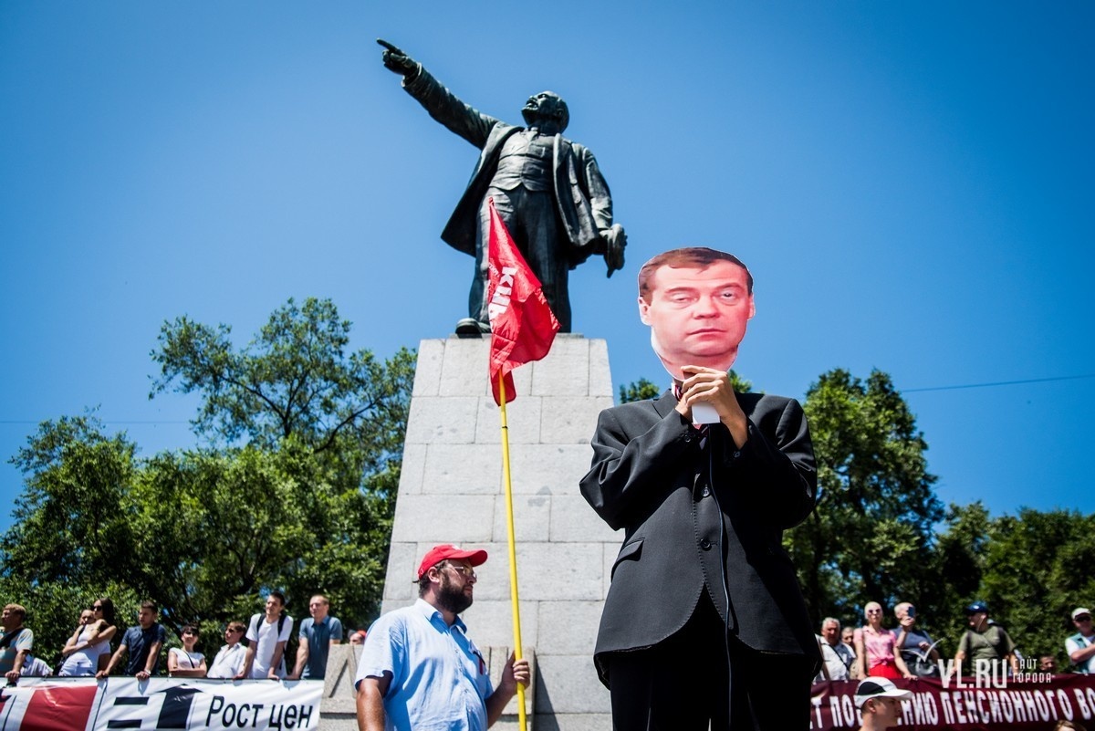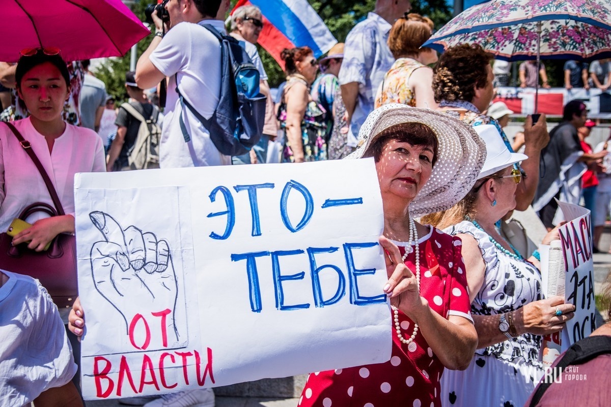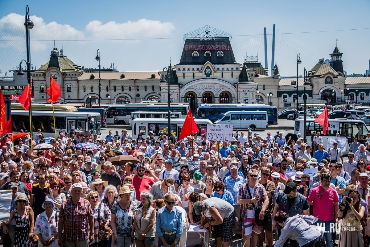Около 1800 человек собрал митинг против повышения пенсионного возраста и НДС на привокзальной площади во Владивостоке. Коммунисты, дети войны, горожане, активисты штаба Навального оставляли подписи за отмену реформ и требовали отставки правительства и президента, народного суда над чиновниками, продавливающими «антинародные законопроекты», и прекращения «издевательств властей над населением». Подписи приморцев будут направлены в правительство с предложением провести референдум против повышения пенсионного возраста.