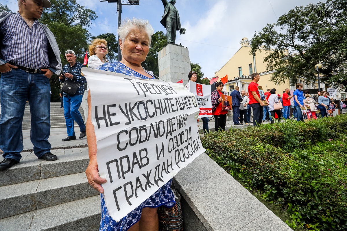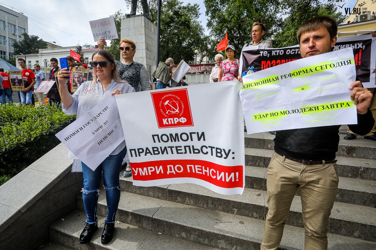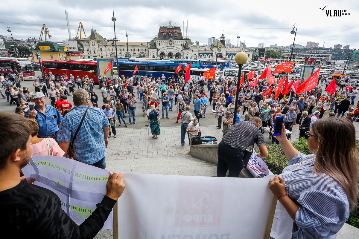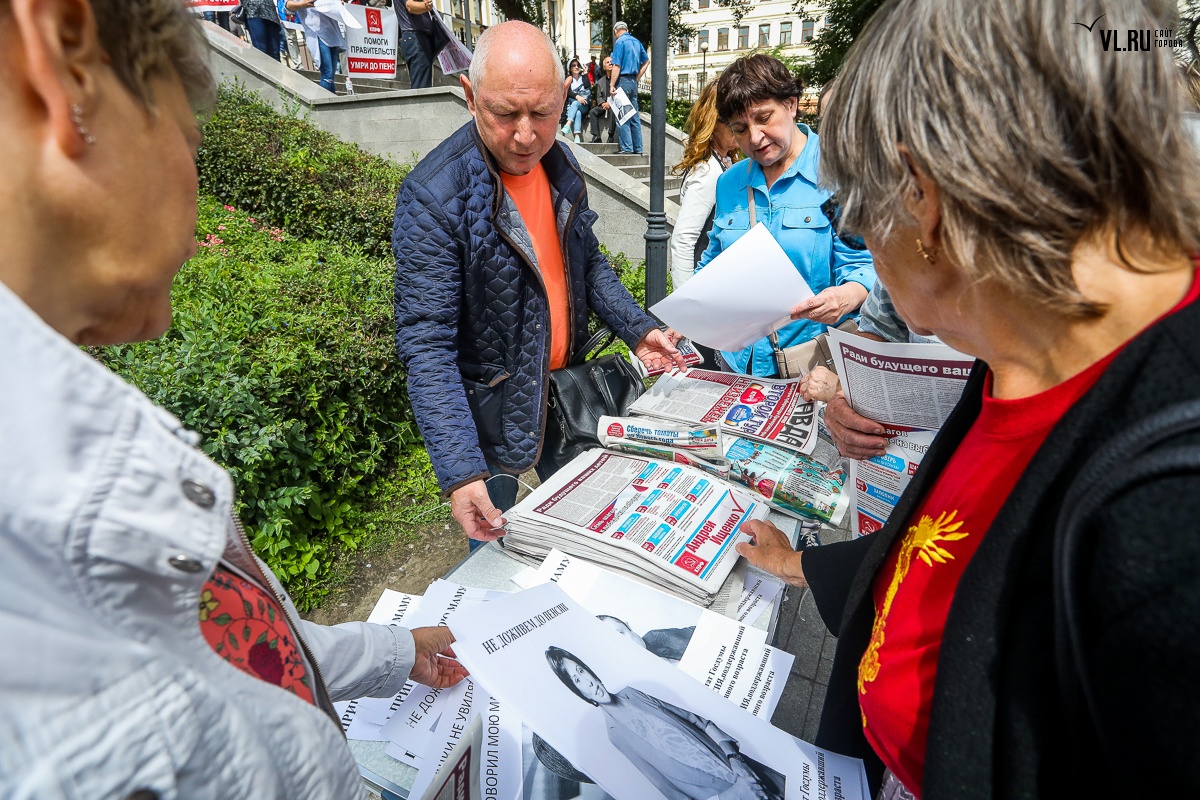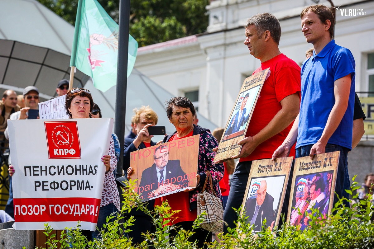 Организаторы и участники акции убеждены: пенсионная реформа − «античеловеческие преобразования». Лидер приморских коммунистов Анатолий Долгачев под памятником вождю мирового пролетариата первым взял слово и назвал правящую власть «барыгами», а российский триколор − «власовской тряпкой». Он потребовал «отправить в отставку правительство Дмитрия Медведева», «отстранить врио губернатора Андрея Тарасенко», а всех депутатов, голосовавших за изменения в пенсионной реформе, призывал «предать народному суду».