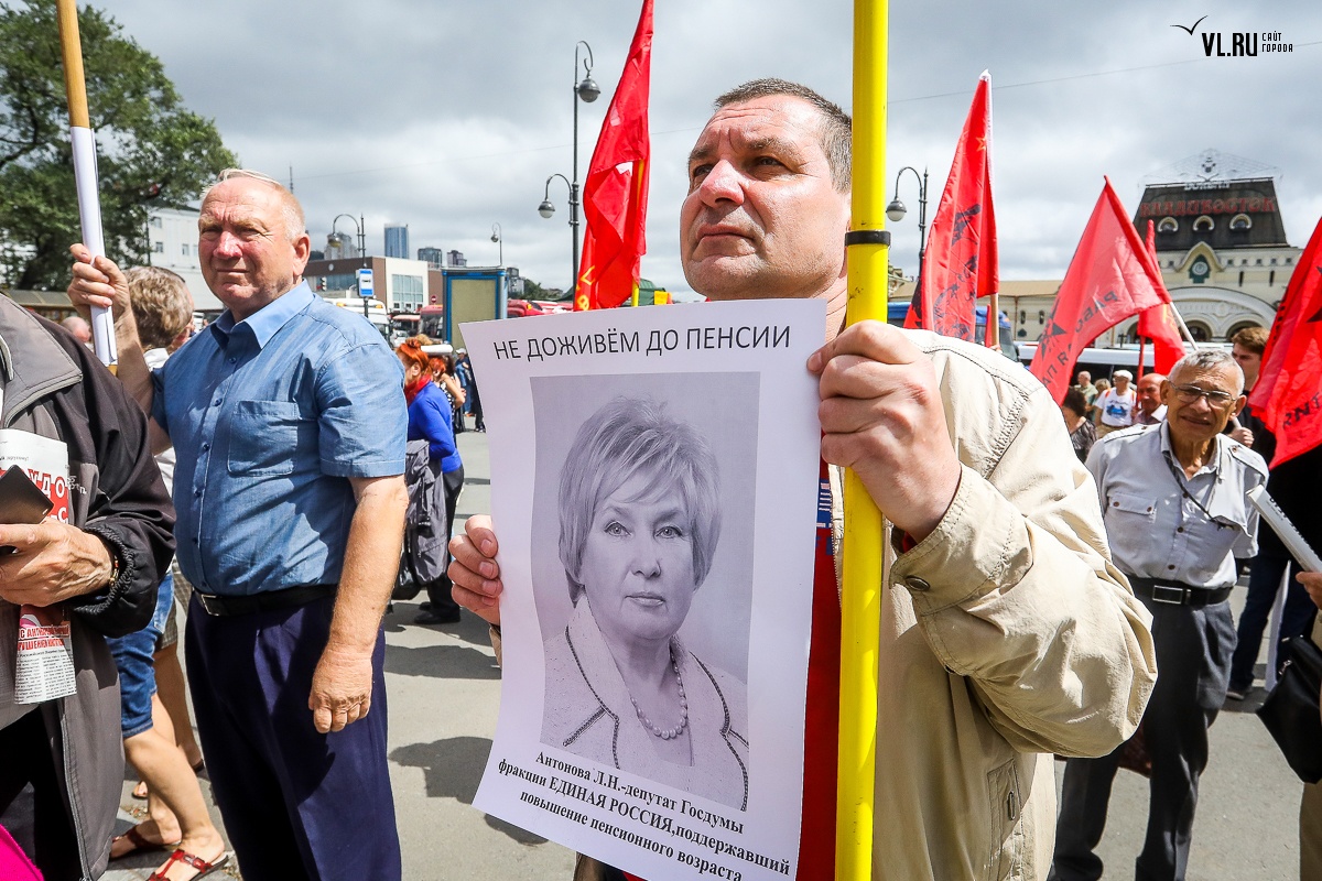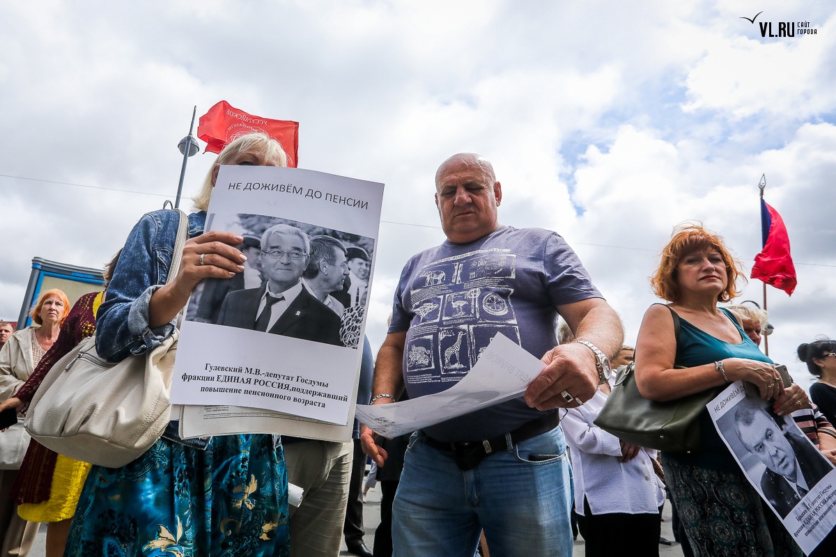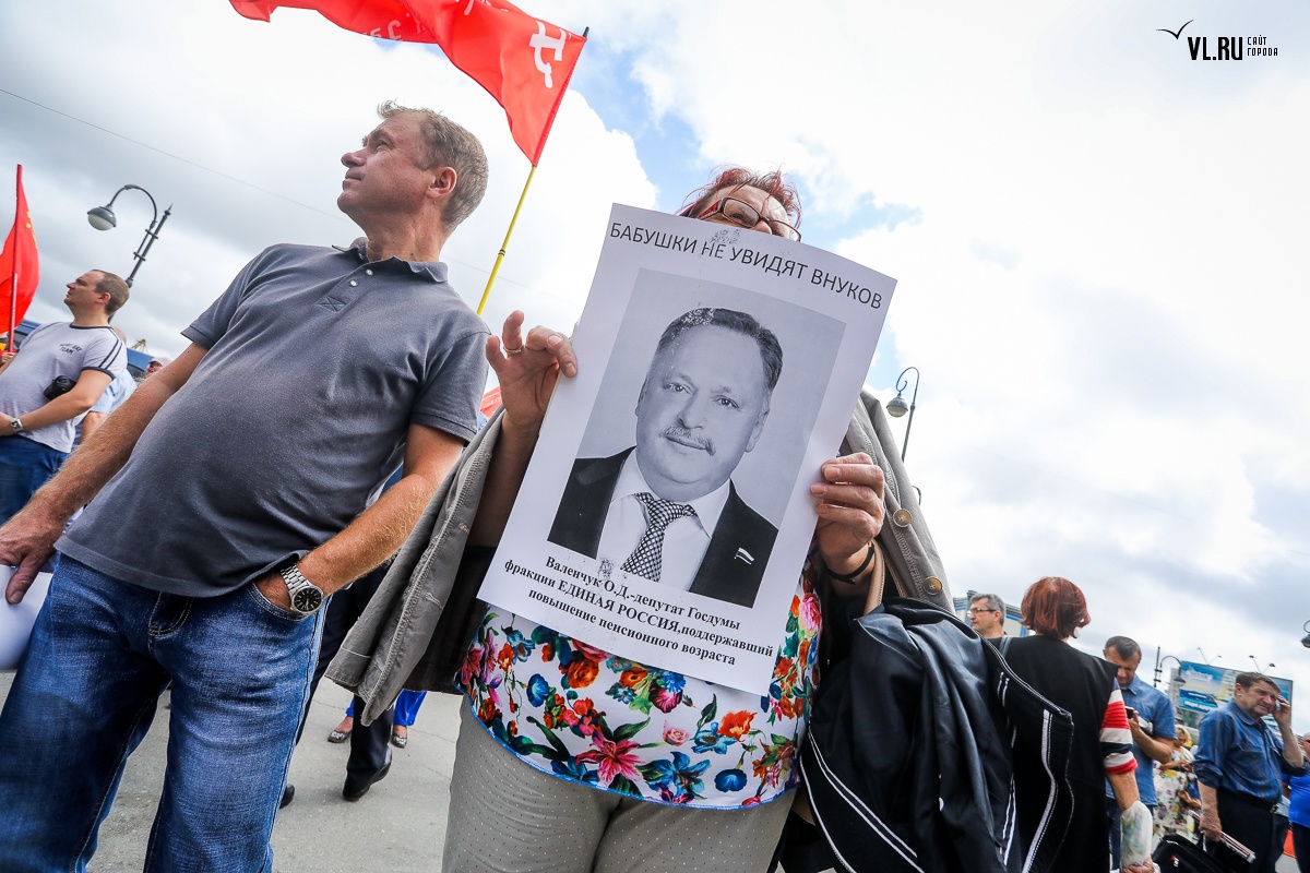 В воскресенье, 2 сентября, недовольные повышением пенсионного возраста жители Владивостока вышли на очередную акцию протеста, требуя отставки правительства. На согласованном митинге на привокзальной площади более 800 собравшимся показали портреты голосовавших за законопроект депутатов и чиновников.