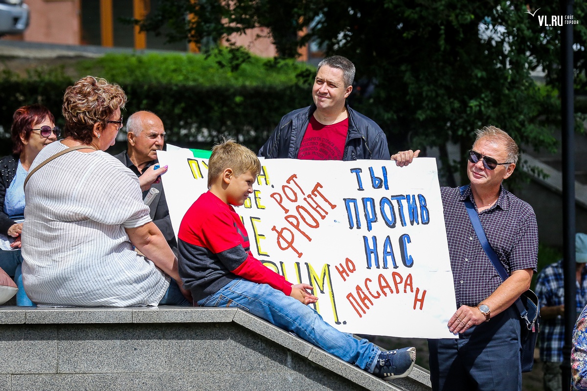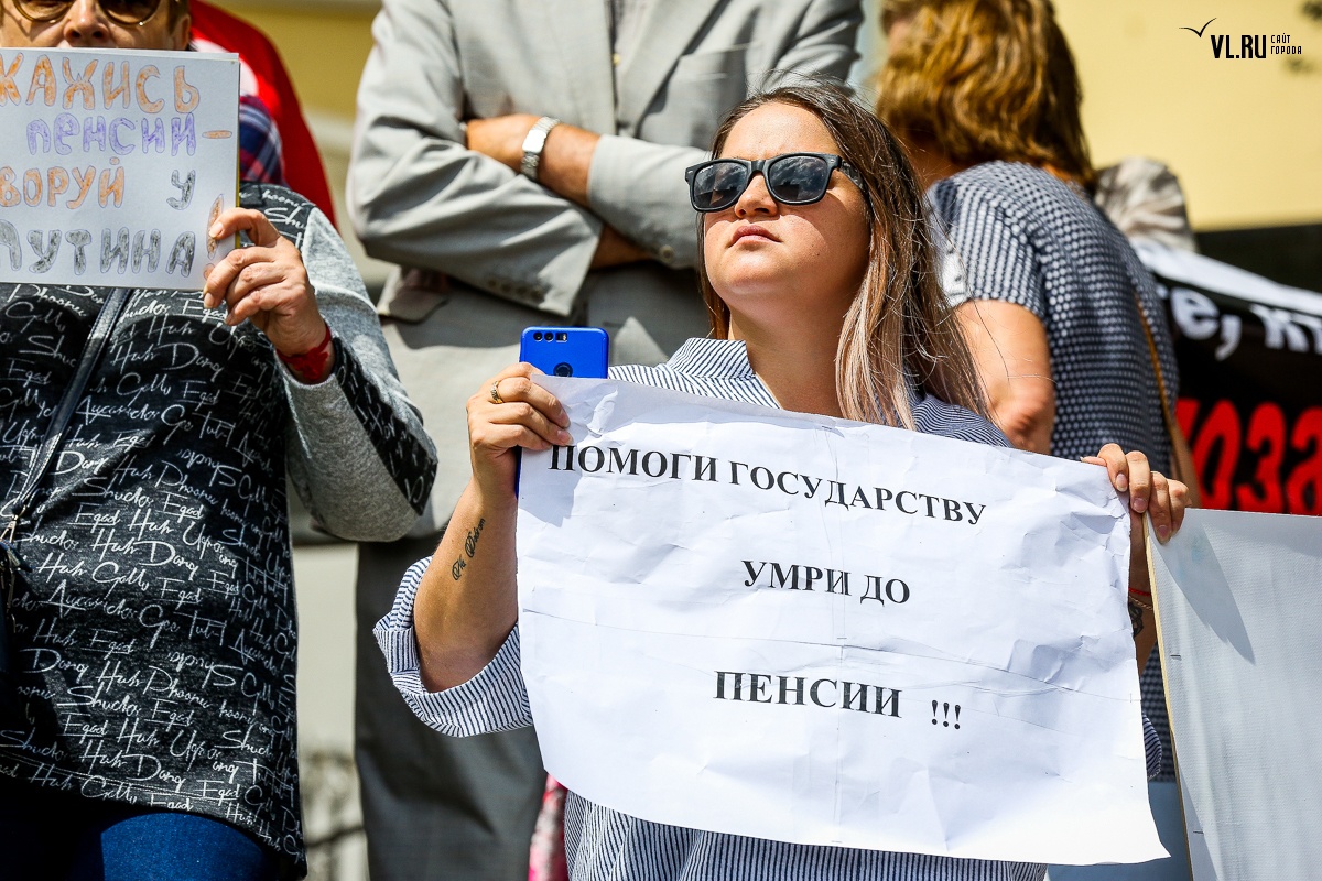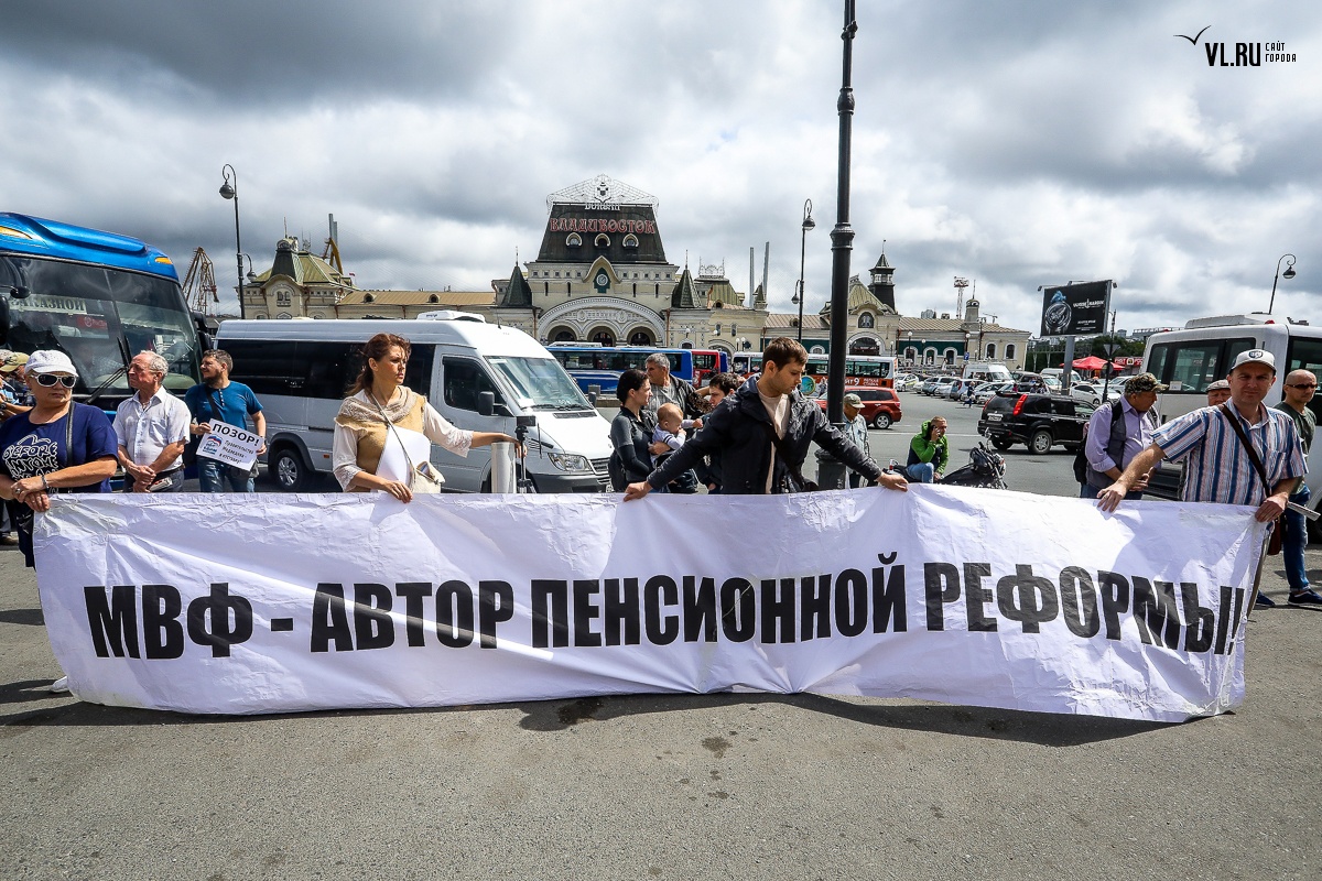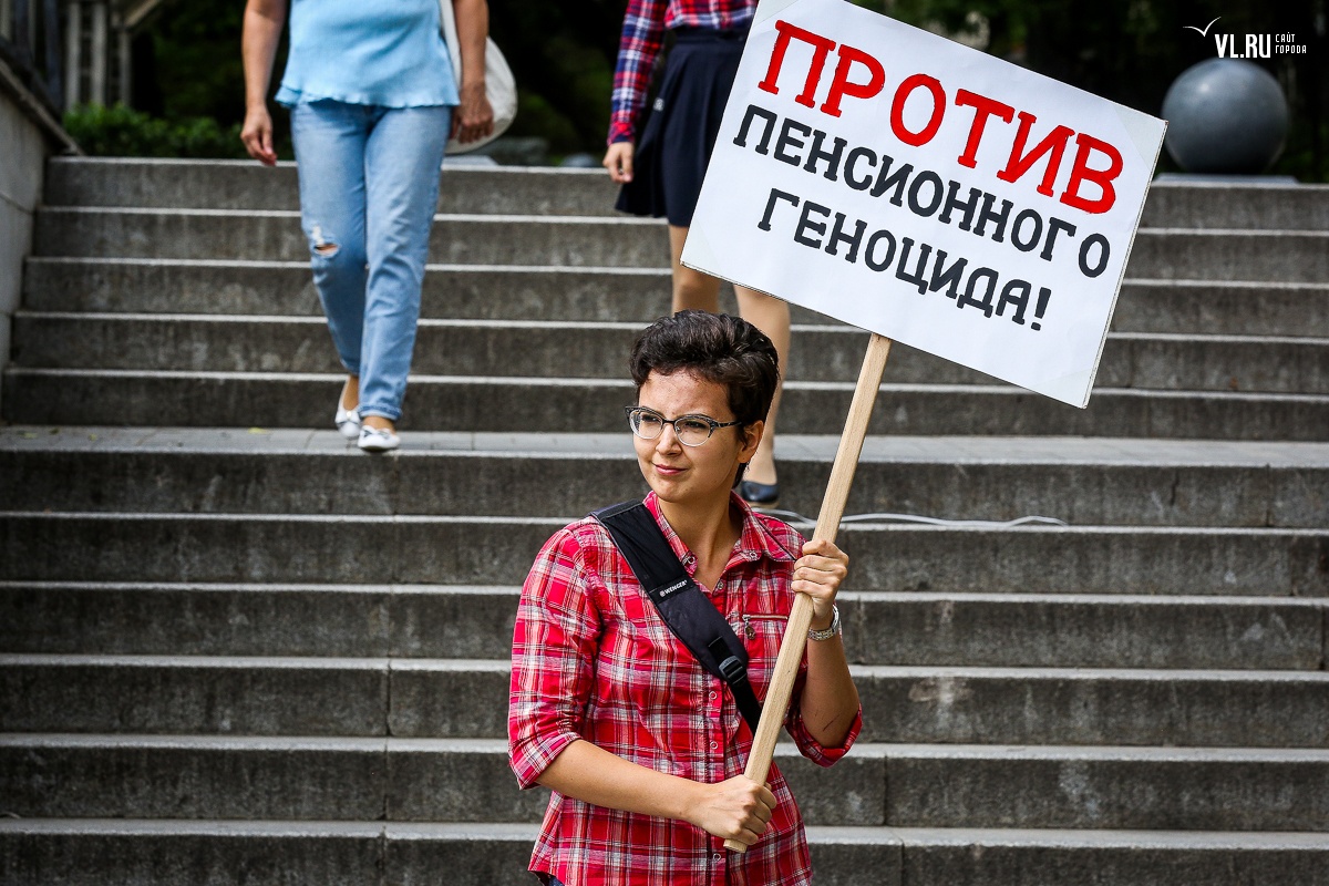 В воскресенье, 2 сентября, недовольные повышением пенсионного возраста жители Владивостока вышли на очередную акцию протеста, требуя отставки правительства. На согласованном митинге на привокзальной площади более 800 собравшимся показали портреты голосовавших за законопроект депутатов и чиновников.