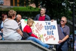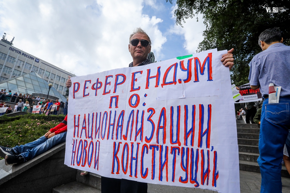 Владимир – адвокат. На митинг пришел с плакатом «Референдум о национализации новой конституции». «То, что недавно предложил Путин по смягчению пенсионной реформы, не что иное, как заигрывание с народом. Президент – сказочник! Кто теперь ему будет доверять? Что творит наша власть – это антинародная политика. Я хочу, чтобы основные богатства государства − землю, ресурсы и заводы − вновь национализировали. Это должно принадлежать народу», − считает Владимир.