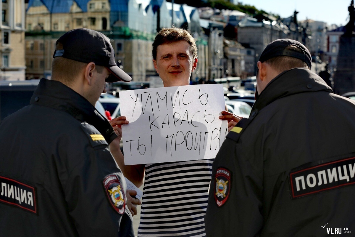13:15: Вокруг крыльца администрации края люди вышли на одиночные пикеты. Пять человек с плакатами. Среди них и Максим Шинкаренко. Он стоит под палящим солнцем уже более 4 часов, с 9 утра. Он не собирается уходить и говорит, что «скорее упадет в голодный обморок, чем уйдет с площади».