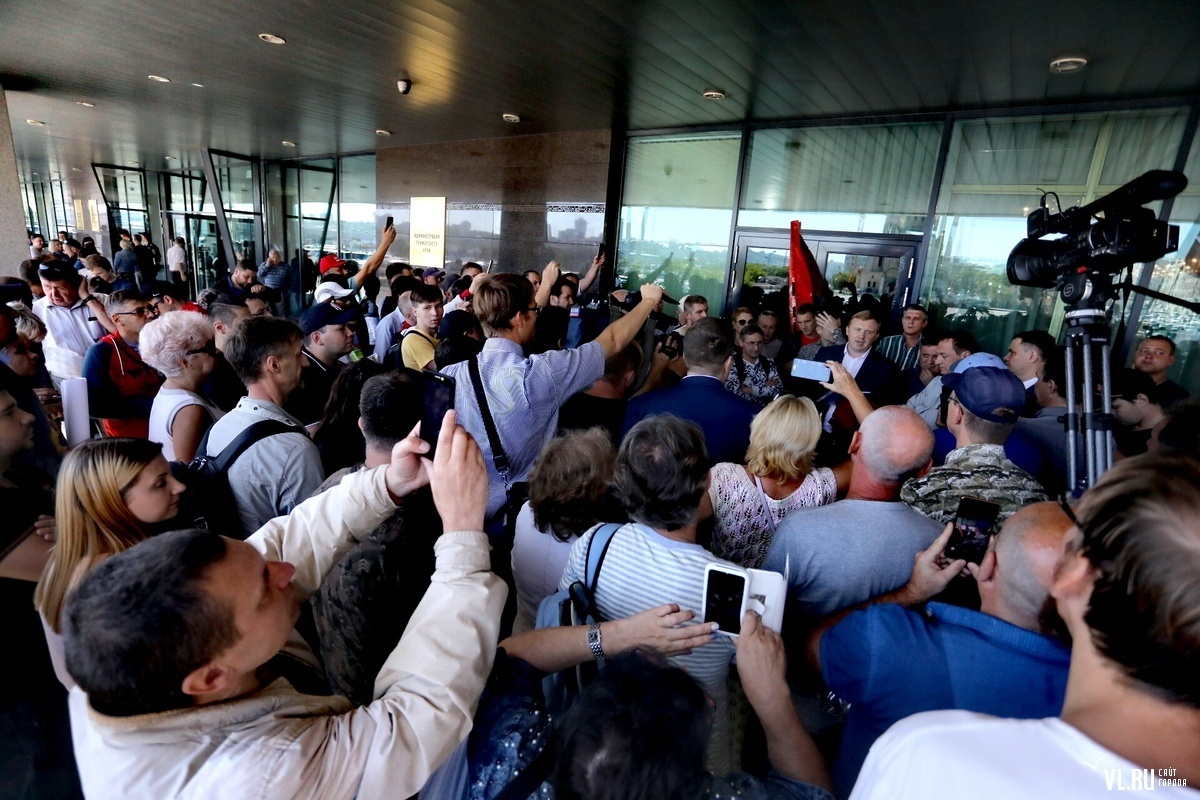 К полудню на площади собрались больше сотни человек. Несмотря на первый рабочий день, они решили не ехать в офисы, а выйти к зданию администрации Приморского края и выразить свою гражданскую позицию. Здесь же – депутаты Государственной думы от КПРФ. Они отмечают, собрание – не митинг, а встреча депутатов Госдумы с жителями края, которые не довольны результатами губернаторских выборов.