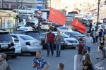Двое участников акции привлекают внимание проезжающих мимо автомобилистов. Выходят к дороге на Светланской с советскими флагами. Светланская почти стоит, автомобилисты громко сигналят, поддерживая собравшихся.