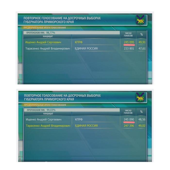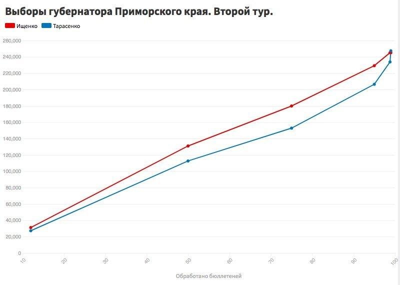 Выборы в Приморье выборами назвать язык не поворачивается. Когда люди в защитных костюмах и масках приходят зачищать территориальную избирательную комиссию https://www.youtube.com/watch?v=PDlPyUVjsMc. Когда после подсчёта 98,77% голосов у кандидата от КПРФ 245 095 голосов, а после подсчёта 99,03% - 245 090, на 5 голосов меньше. Когда в последний момент всю ночь значительно проигрывавший единоросс вдруг резко набрал несколько тысяч голосов (этот момент хорошо видно на графике). Благодаря переписанным протоколам, естественно.