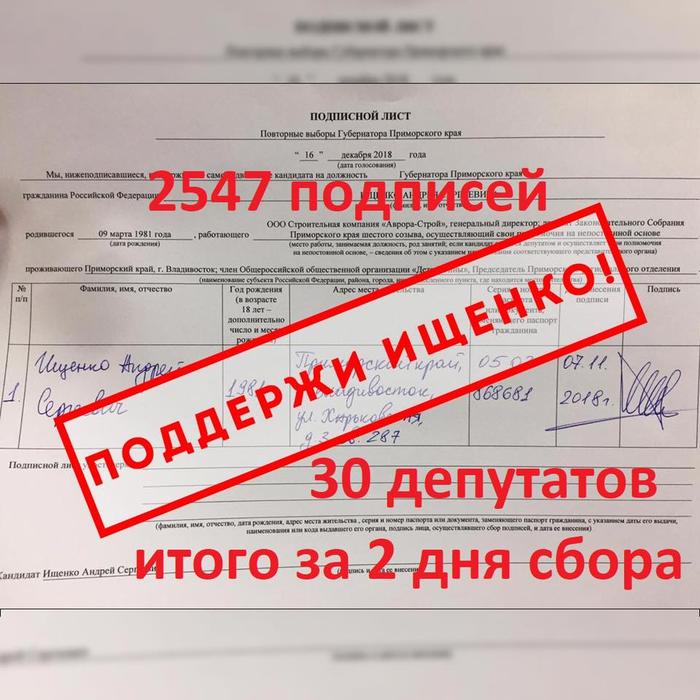 Интернет-СМИ "Новости Владивостока" сообщает, что в Приморье идет активный сбор подписей за кандидата в губернаторы А.Ищенко.