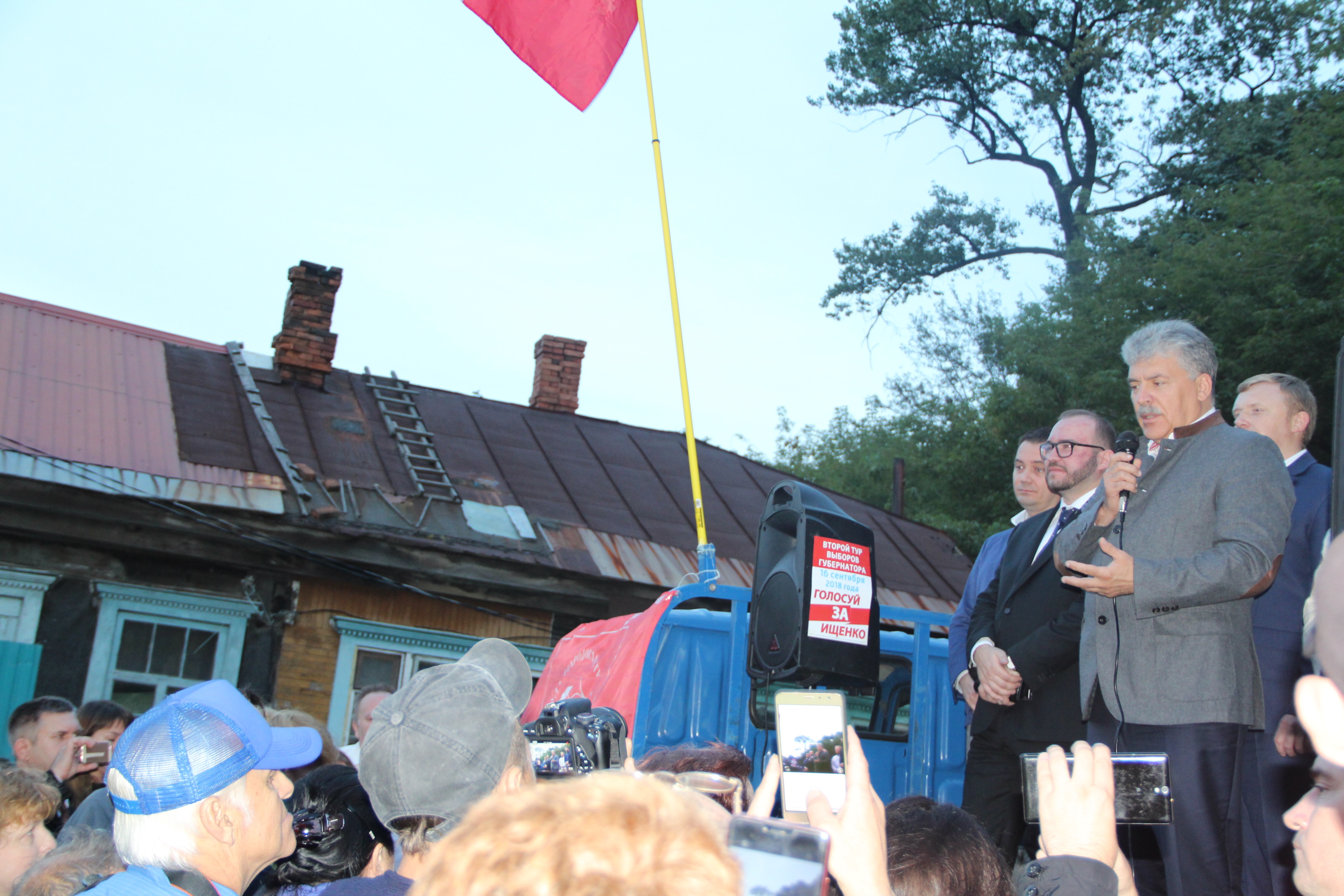 После посещения Спортивной набережной Павел Грудинин в 19:00 прибыл на встречу с гражданами организованную в частном секторе близ ВГУЭС краевым отделением КПРФ. На встрече присутствовало более 1000 человек, которые приветствовали директора совхоза им.Ленина аплодисментами и выкриками о поддержке. После выступления Павла Грудинина и Андрея Ищенко, в котором звучал призыв поддержать кандидата от КПРФ на выборах, Александром Ющенко, руководителем пресс-службы ЦК КПРФ, было сделано заявление, что завтра, в субботу, по поручению председателя ЦК КПРФ Г.А. Зюганова, в Приморье прибывает команда депутатов Государственной думы для контролирования хода выборов. После выступлений ораторов, десятки граждан задавали актуальные и волнующие их вопросы Народному президенту Грудинину и кандидату в губернаторы Ищенко, на каждый из вопросов был дан полноценный и развернутый ответ. Вопросы касались развития Приморского края в целом, отраслей его хозяйства, перспективах улучшения уровня жизни после победы красного губернатора.