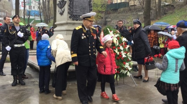 Именно к этому памятнику и были возложены цветы Владимиром Гришуковым, дабы почтить память всех моряков Тихоокеанского флота, павших в борьбе за социалистическую Родину.