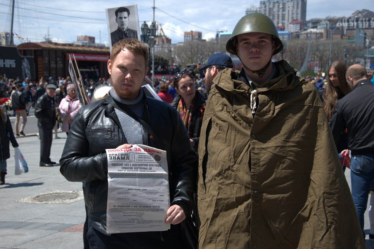 Группа членов Приморского краевого отделения Союза советских офицеров, приняла участие в раздаче копий газеты «Правда» 1945-ого года выпуска на Корабельной набережной Владивостока.