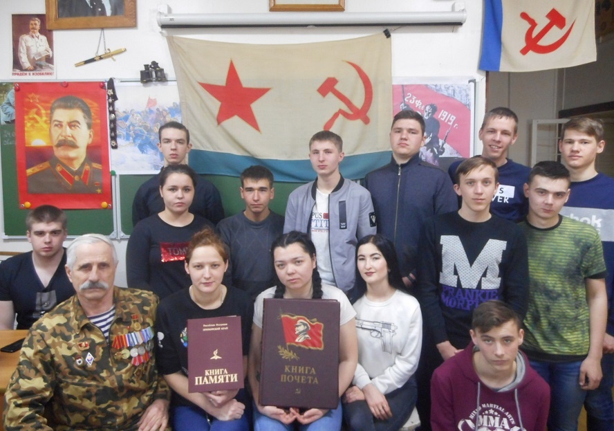 22 февраля в группе ЭМ-21 Приморского колледжа лесных технологий, экономики и транспорта состоялся воспитательный час «Несокрушимая и легендарная». Студенты ознакомились с историей создания Красной Армии; пролистали Книгу Памяти по Приморскому краю, найдя в ней много знакомых фамилий; прикоснулись к боевым орденам Великой Отечественной войны; сфотографировались на фоне легендарного военно-морского флага Советского Союза.