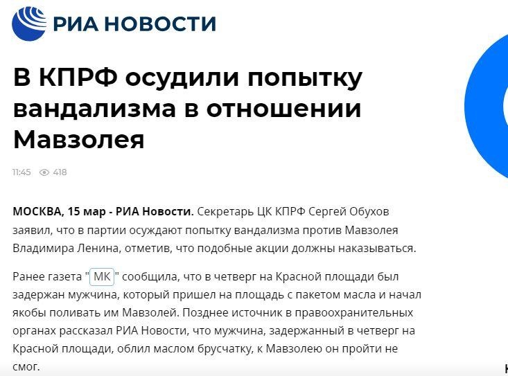 "В любом случае акты вандализма и против Мавзолея, и против памятников Ленину как отцу-основателю нынешней Российской Федерации и СССР не новость. Подобные попытки были и в советское время, мы это помним. Но надо проверять, что это за человек, даже если это политические оппоненты, должны быть цивилизованные нормы дискуссии, а не "ломать, крушить", по крайней мере, КПРФ за это выступает", - сказал Обухов РИА Новости.