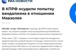 В КПРФ осудили попытку вандализма против Мавзолея Ленина на Красной площади и призвали наказывать за подобные акции. Об этом «РИА Новости» сообщил член Президиума, секретарь ЦК КПРФ Сергей Обухов.