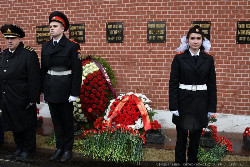 Цветы возложили к могилам первого космонавта Ю.А. Гагарина и конструктора первых советских космических ракет С.П. Королева, а также к могилам В.С. Серегина, космонавтов В.М. Комарова, Г.Т. Добровольского, В.Н. Волкова, В.И. Пацаева, советских ученых И.В. Курчатова и М.В. Келдыша.
