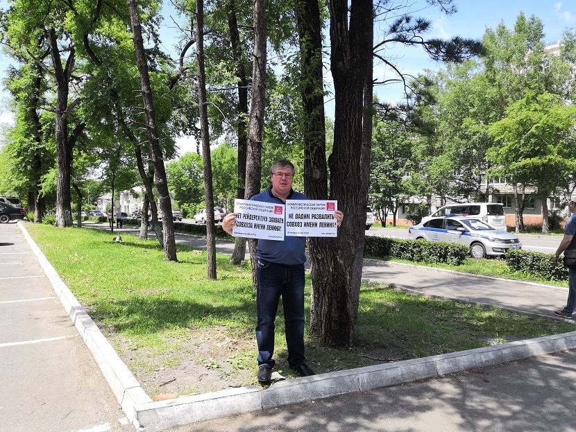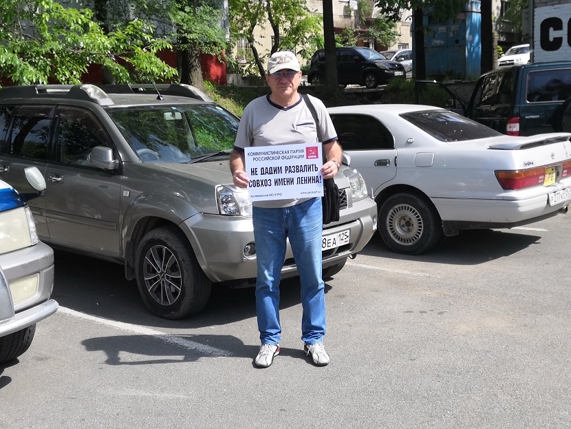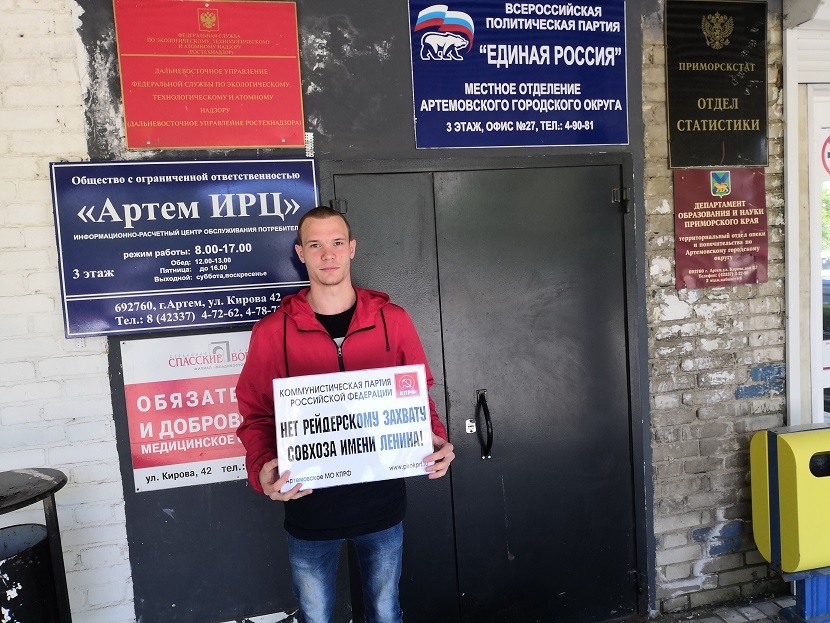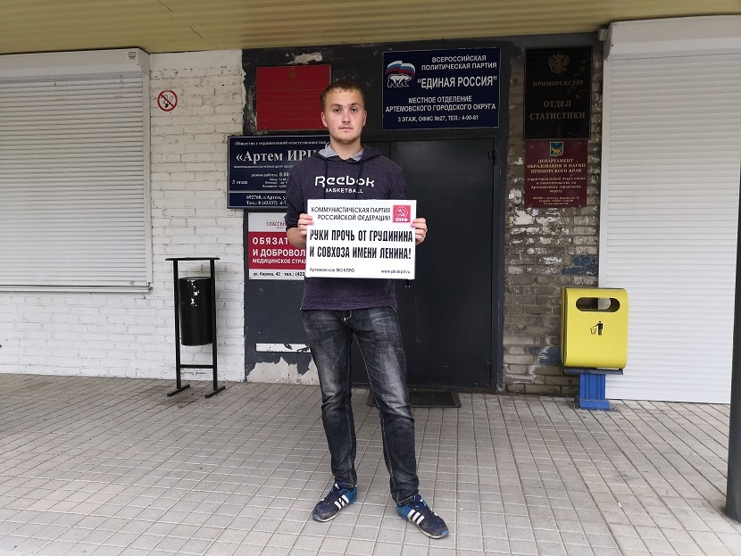 В пятницу, 7 июня 2019 года, в городе Артёме члены КПРФ и Ленинского комсомола, сторонники партии провели одиночные пикеты в поддержку Павла Грудинина и уникального совхоза имени Владимира Ильича Ленина, в отношении которого предпринимаются попытки рейдерского захвата. А уже 14 июня в городе Артёме состоится массовая акция протеста против нескрываемой расправы власти и прочих махинаторов над народным кандидатом в президенты России и его трудовым коллективом!