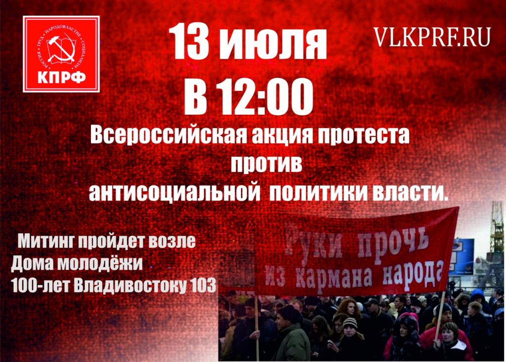Приглашаем всех неравнодушных принять участие в митинге против антисоциальной политики власти. Митинг пройдет 13 июля в 12:00 часов возле Дома молодёжи: проспект 100 лет Владивостоку, 103.