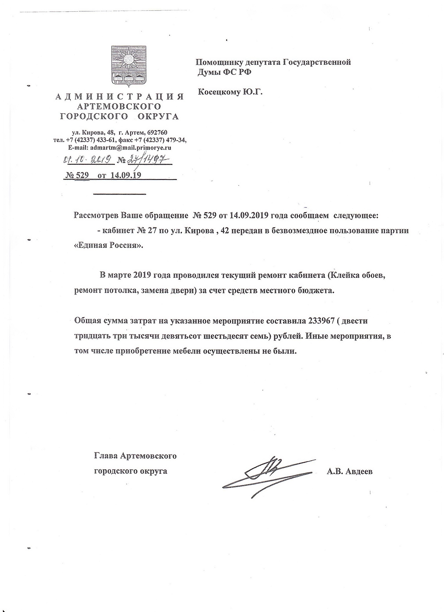 И ведь, что удивительно, мэр даже не пытается скрывать информацию об израсходованных бюджетных средствах не по назначению. Так и отвечает прямым текстом на запрос Юрия Касецкого – помощника депутата Государственной Думы ФС РФ Корниенко А.В.: да, деньги потратили на единороссов, и помещение им предоставили в безвозмездное пользование. Это откуда же такие сказочные преференции в пользу одной партии - «Единая Россия»? Что же такого полезного и важного сделала она для жителей города Артема, чем заслужила такие почести?