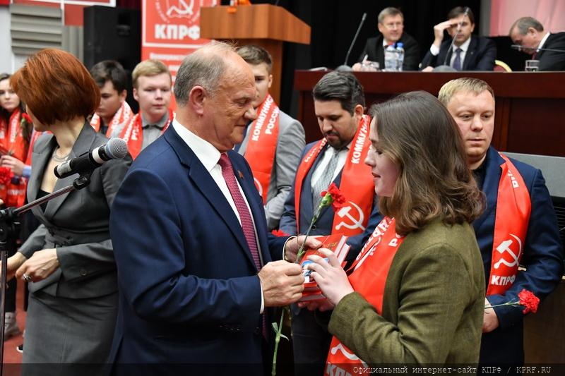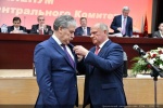 Затем Г.А. Зюганов вручил партийные билеты молодому пополнению коммунистов. Группа ветеранов партии была награждена памятными медалями ЦК КПРФ «150 лет В.И. Ленину».