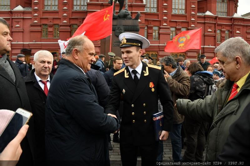 В ходе торжественной церемонии цветы были также возложены к памятнику Маршалу Советского Союза Г.К. Жукову. Здесь же состоялось вручение памятных наград. А вновь вступившие в ряды КПРФ товарищи получили из рук Г.А. Зюганова партийные билеты.