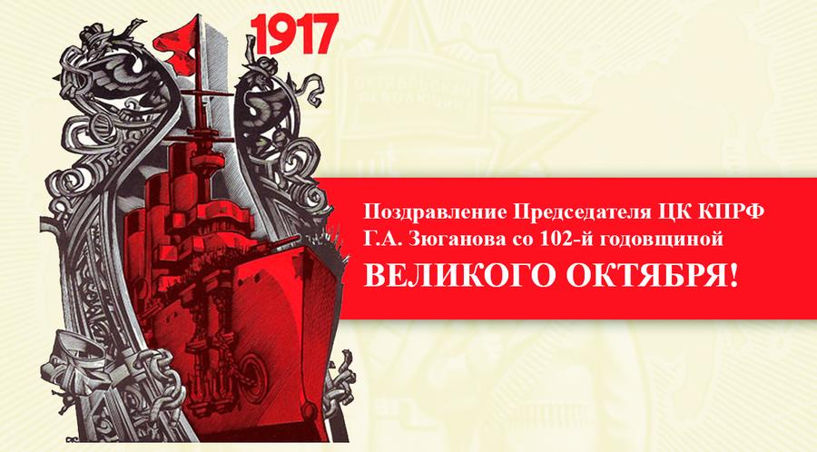 Уважаемые товарищи! От души поздравляю Вас с праздником — 102-й годовщиной Великой Октябрьской социалистической революции! Это день, когда нужно воздать славу тому, что совершили наши предки во главе с Лениным и партией большевиков. Они так стремились видеть свою Родину грамотной, могучей, богатой, справедливой и счастливой! Эту мечту они превратили в дело своей жизни — и добились её воплощения! Изумлённый мир увидел, как из руин рухнувшей империи восстала Советская Держава. Она преодолела вековое отставание, сделала созидание национальной идеей, открыла человечеству космические горизонты.