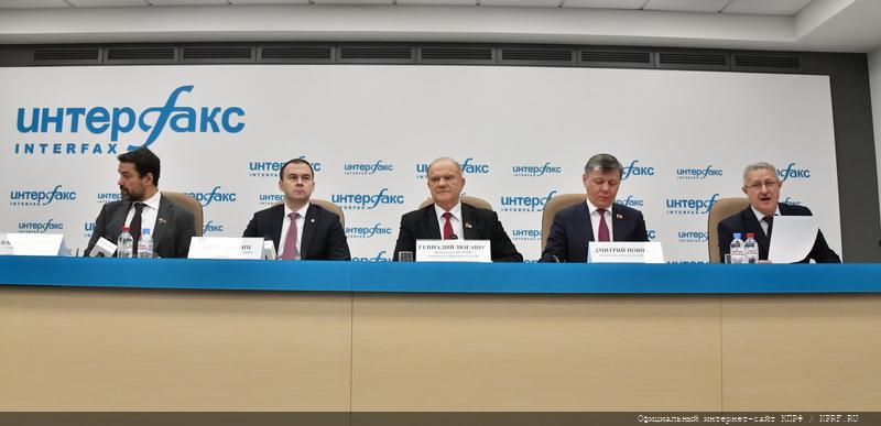 3 декабря в ИА «Интерфакс» состоялась пресс-конференция руководства КПРФ, посвященная итогам уходящего года и планам КПРФ на будущий год. В ней приняли участие Председатель ЦК КПРФ Г.А. Зюганов, заместители Председателя ЦК КПРФ Ю.В. Афонин и Д.Г. Новиков, руководитель пресс-службы ЦК КПРФ А.А. Ющенко.