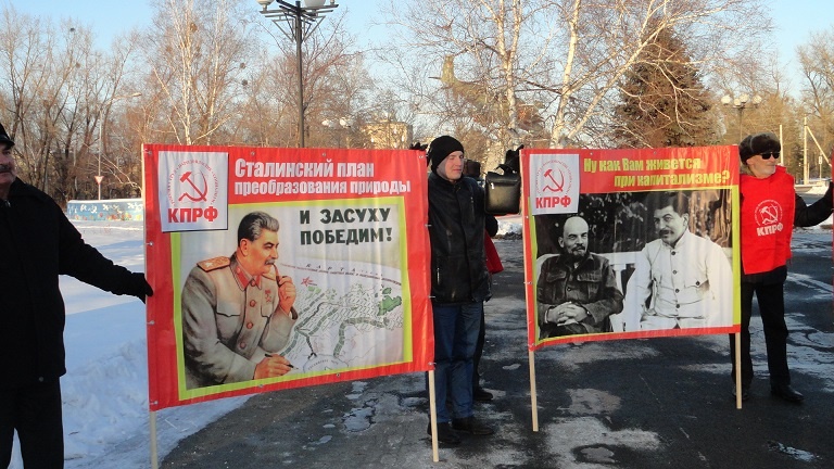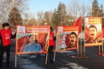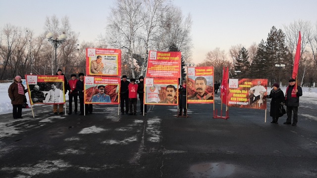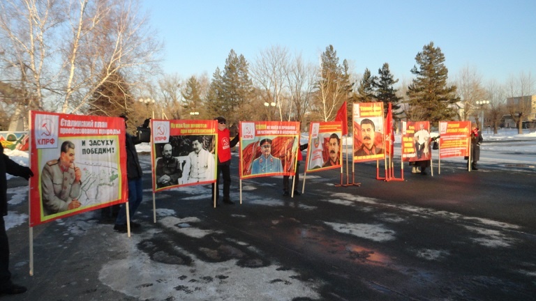 Пикетчики развернули шесть баннеров с портретами И.В. Сталина и лозунгами: «Сталин – наше знамя боевое!», «Конституция СССР является единственной в мире до конца демократической конституцией», «Сталин не ушёл в прошлое – он растворился в будущем», «Сталинский план преобразования природы - «И засуху победим!», «Ну как Вам живётся при капитализме?», «Ну что, товарищи, теперь Вы поняли, кто такие враги народа?».