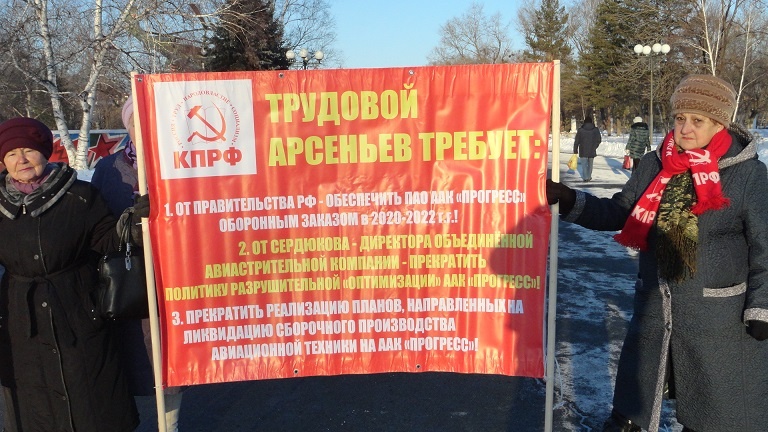 Так же был выставлен баннер с требованием к правительству России - «Обеспечить ПАО ААК «Прогресс» оборонным заказом», к Сердюкову - «Прекратить политику разрушительной «оптимизации» Арсеньевской авиационной компании «Прогресс», «Прекратить реализацию планов по ликвидации сборочного производства авиационной техники на ААК «Прогресс».