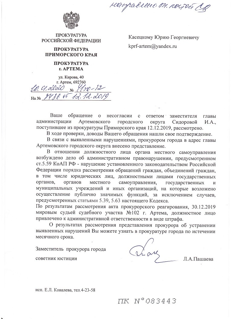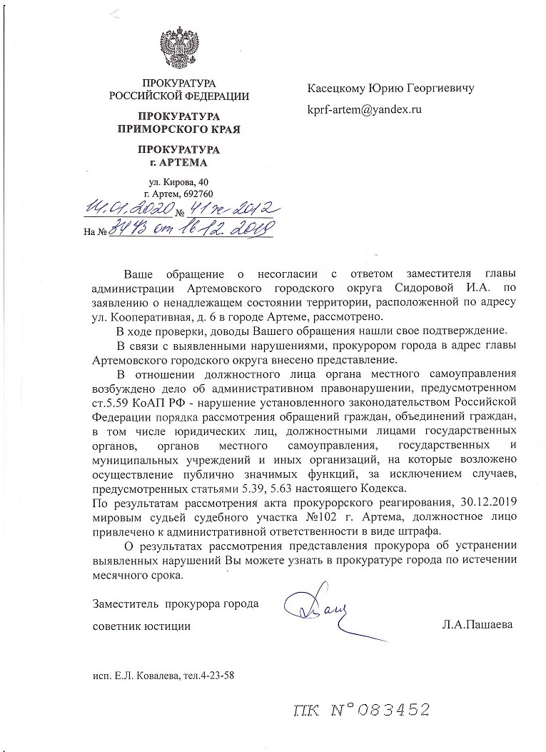 Ранее в прокуратуру города Артёма обратился Юрий Касецкий, который является помощником депутата Государственной Думы ФС РФ от КПРФ Корниенко А.В. В своем заявлении он просил привлечь к ответственности должностное лицо городской мэрии, отказавшее ему в предоставлении информации на письменные обращения. Заместитель мэра Сидорова И.А. по понятным только ей причинам посчитала возможным не раскрывать планы администрации АГО по благоустройству детского парка. А также она отказалась сообщать, на каком основании ремонт помещений в средней школе №31 проводился в разгар нового учебного года в присутствии в учебном учреждении учащихся, что строго запрещено законом.