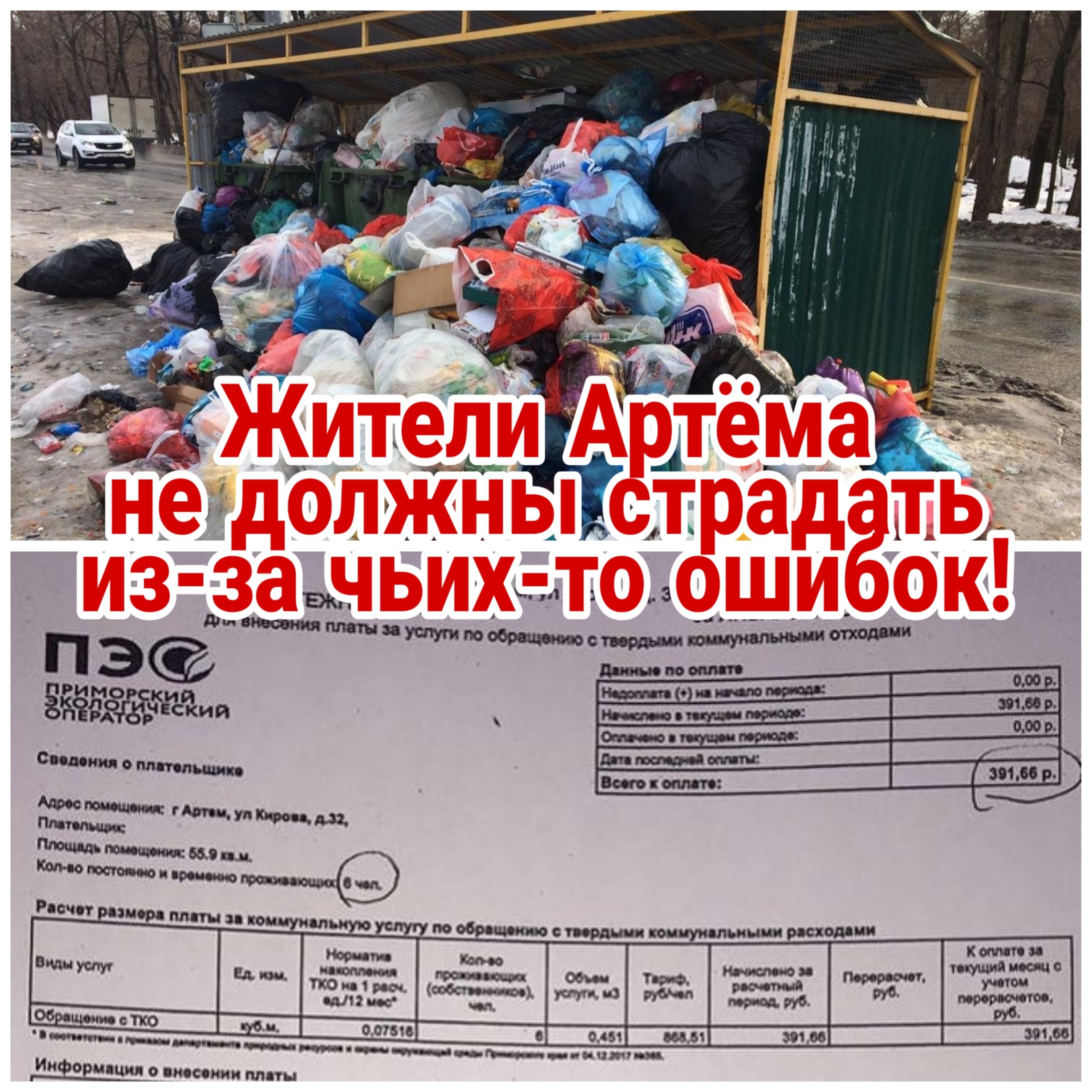 Население города Артёма не должно платить за "мёртвых душ" и за воздух в пакетах вместо мусора. Ошибки и просчёты регионального экологического оператора не должны становиться головной болью рядовых жителей. Неграмотная, поспешная "мусорная реформа", затеянная властями с целью очередного выбивания денег с потребителей, должна быть пересмотрена, включая сомнительные тарифы.