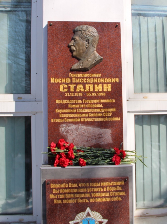 Затем участники акции возложили цветы к мемориальной доске И.В. Сталина, которая была открыта в прошлом году возле здания крайкома КПРФ, почтили минутой молчания память великого соотечественника.