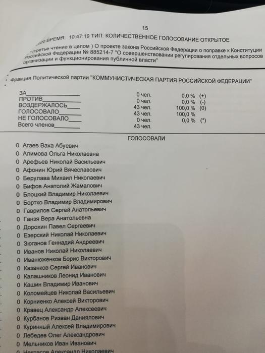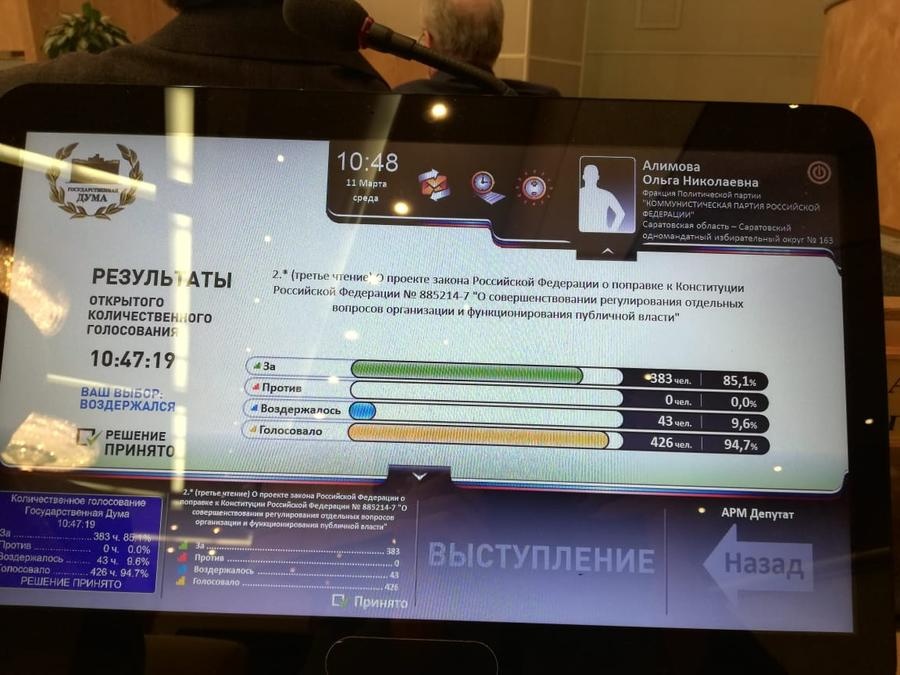Сегодня, 11 марта, в Госдуме было принято судьбоносное решение по принятию поправок номер один и два в Конституцию РФ. Единогласно их поддержали фракции ЕР, СР и ЛДПР. Депутаты-коммунисты не согласились поддерживать ряд поправок, связанных с продлением полномочий действующего президента, не принятием поправок КПРФ о выходе на пенсию в 60 лет – мужчин, в 55 лет – женщин, и ряд других, но в то же время частично была согласны с социальным блоком. Поэтому фракция КПРФ воздержалась в полном составе.