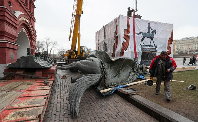 Просто какая-то спецоперация прошла практически у стен Кремля — неизвестные подменили на Манежной площади памятник маршалу Георгию Жукову. Приехал кран, грузовик, появились рабочие, которые соорудили занавес из баннеров вокруг постамента, завизжала «болгарка» и уже через несколько часов на месте прежней скульптуры появилась новая. Тоже в образе Жукова. Старый ещё некоторое время валялся на земле на коне со спиленными ногами, потом его увезли. Вроде как ничего и не произошло — памятник на прежнем месте, такого же размера, конь присутствует, маршал восседает на нём, есть лишь небольшие различия в композиции. Народ в изумлении ахнул: «А царь-то (маршал) не настоящий!».