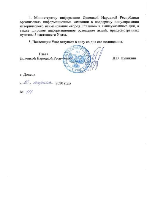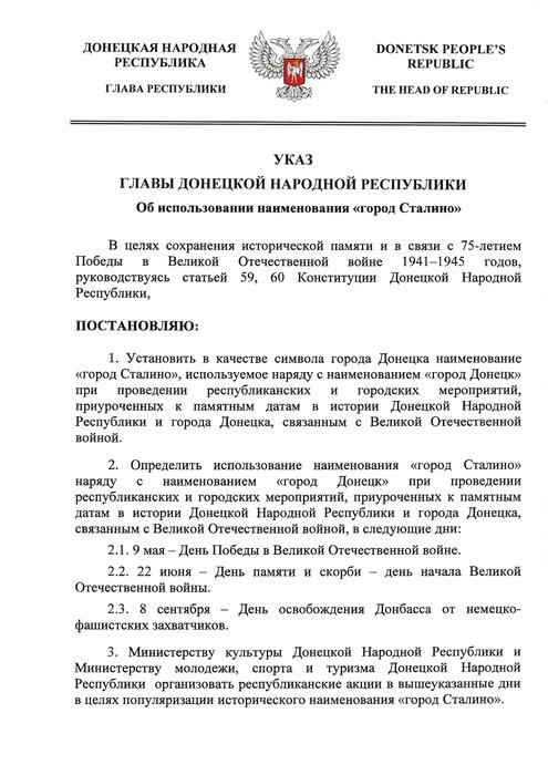 В преддверии 75-ой годовщины Победы братских народов Союза Советских Социалистических Республик в Великой Отечественной войне Указом Главы Донецкой Народной Республики Дениса Владимировича Пушилина в качестве символа города Донецка установлено наименование «город Сталино». «город Ворошиловград» в качестве символа города Луганска установлено наименование при проведении республиканских и городских мероприятий Указом Главы Луганской Народной Республики Леонида Ивановича Пасечника. Исторические наименования приурочены к памятным датам и истории обеих Республик и их столиц, связанных с Великой Отечественной войной: 9 мая – День Победы в Великой Отечественной войне, 22 июня – День памяти и скорби – день начала Великой Отечественной войны, 14 февраля День освобождения Луганска (Ворошиловграда) от немецко-фашистских захватчиков, 8 сентября – День освобождения Донбасса от немецко-фашистских захватчиков.
