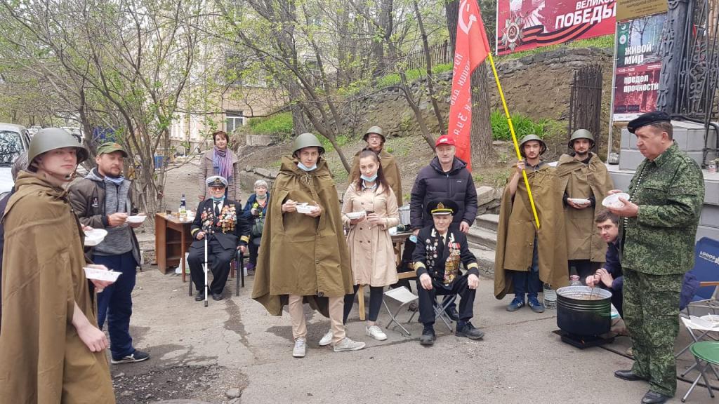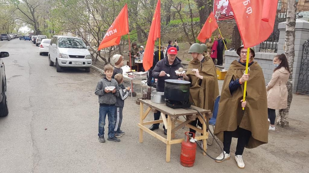 Дополнительно 9 мая с выстрелом пушки в 12:00 на улице Пушкинской возле городского комитета ВГО КПРФ коммунисты организовали музыку, бесплатную раздачу гречневой каши и горячего чая комсомольцами в форме солдат Великой Отечественной войны. Проходившие мимо жители с интересом смотрели на молодых ребят в форме, а некоторые просили сделать фотографии, на что комсомольцы с радостью соглашались.