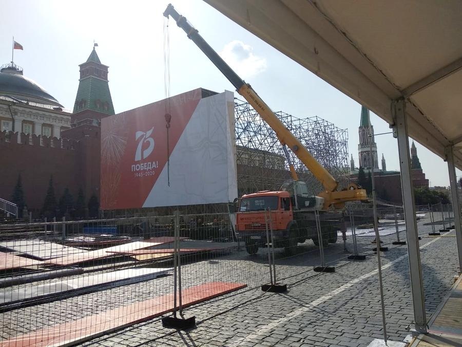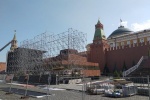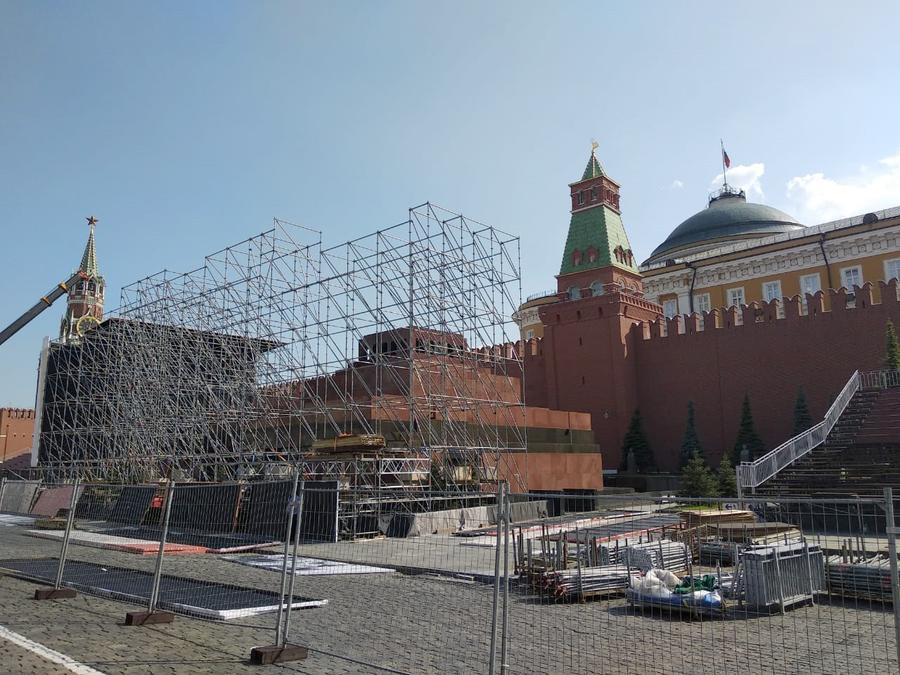Сейчас на Красной площади сооружается гигантская (выше кремлёвской стены!) конструкция, которая, очевидно, призвана опять задрапировать Мавзолей Ленина во время парада Победы 24 июня.