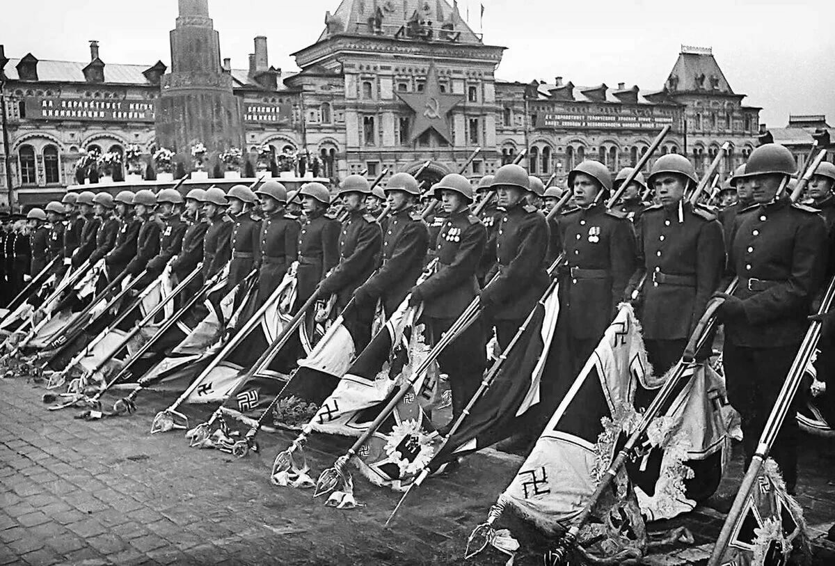 Этот парад не был похож на другие. Самым главным его событием должен был стать особый ритуал – бросание трофейных немецких знамен. Так в своё время поступали со штандартами варваров римские воины. Выдающийся советский историк, академик Евгений Тарле, предложил организаторам парада взять с них пример. В десяти шеренгах по 20 человек в каждой фронтовики должны были пронести от храма Василия Блаженного до Мавзолея 200 знамен германских вооруженных сил и бросить их у его подножия.