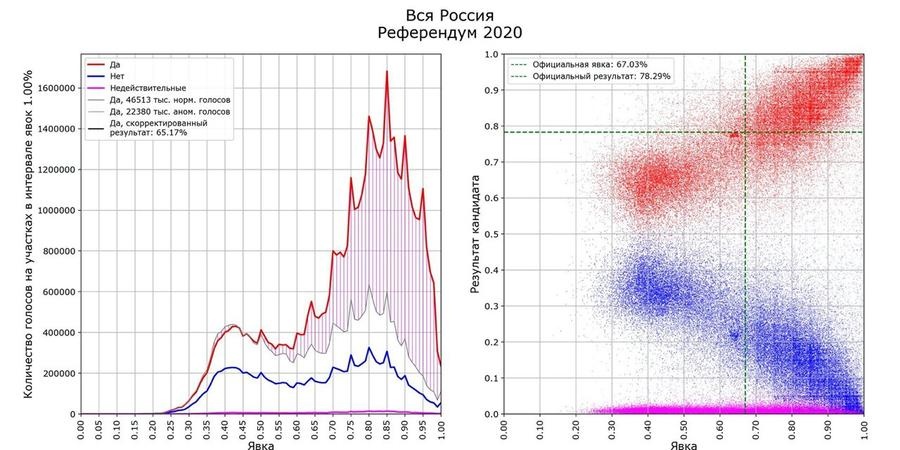 Электоральные эксперты (например, Сергей Шпилькин) на основании математической обработки данных по явке с УИК доказывает, что из 57,6 млн. голосов поданных «за» 22 млн. голосов являются результатом фальсификаций. Если исключить эти голоса из рассмотрения, можно вообразить примерное соотношение голосов граждан, голосовавших добровольно: 68% «за» и 32% «против».