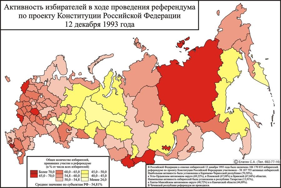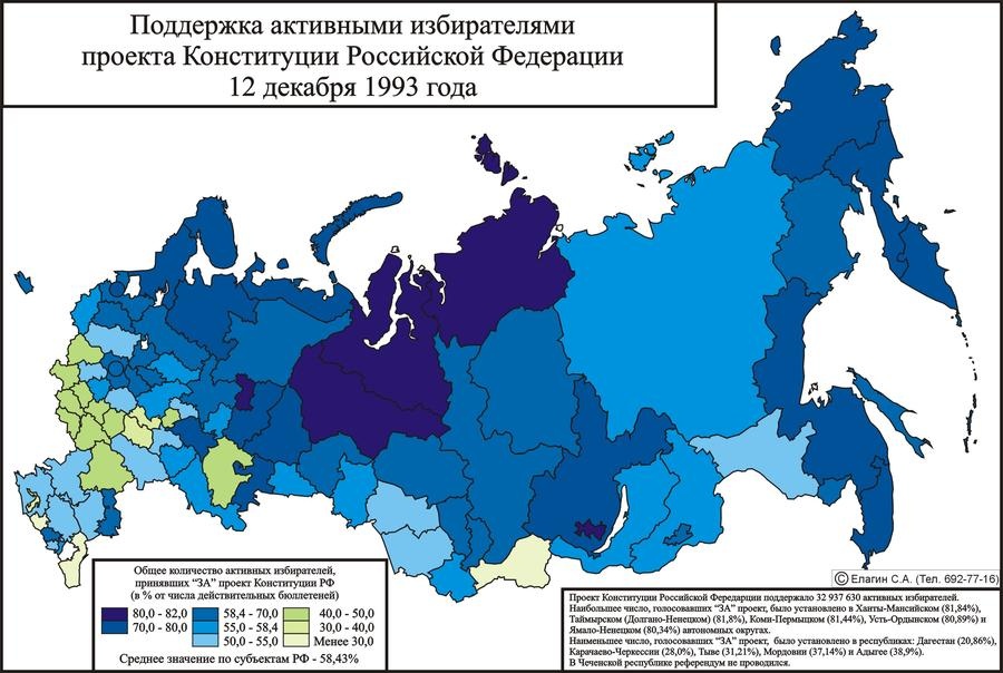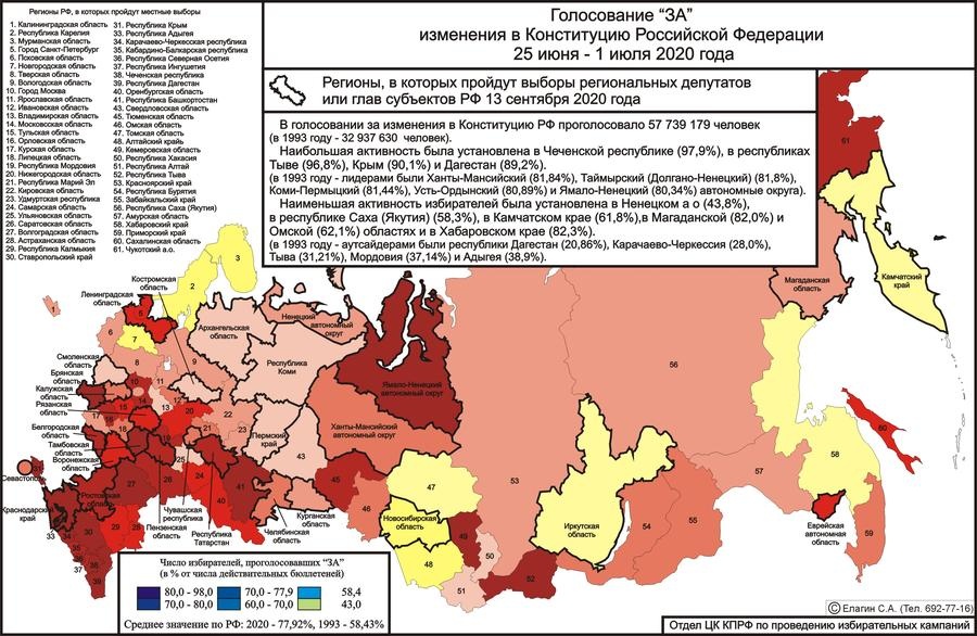 Сравнение конституционных голосований в 1993 и 2020 в пользу нынешнего. Тогда за ельцинский проект проголосовало 32 млн. избирателей, а сегодня за ельцинско-путинский – 57 млн. Но, если в 1993 году наибольшую поддержку власть получила в регионах Урала, Северо-Западного округа и Дальнего Востока. На Северном Кавказе, в Южном Федеральном округе и в Южной части Центрального округа поддержка Ельцинской Конституции была наименьшей. Сейчас же, напротив, наибольшую поддержку поправки в Конституцию получили в регионах Северо-Кавказского, Южного и в южной части Центрального федерального округа.