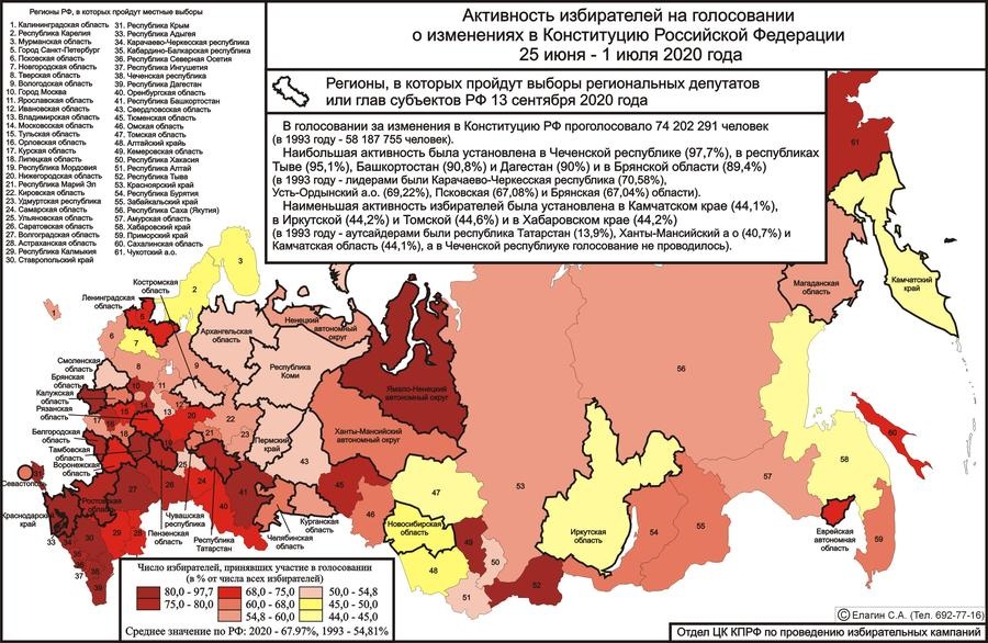 В целом, в 37 регионах страны поправки в Конституцию поддержаны меньшей частью избирателей. В 48 регионах страны обеспечена «абсолютная легитимность».