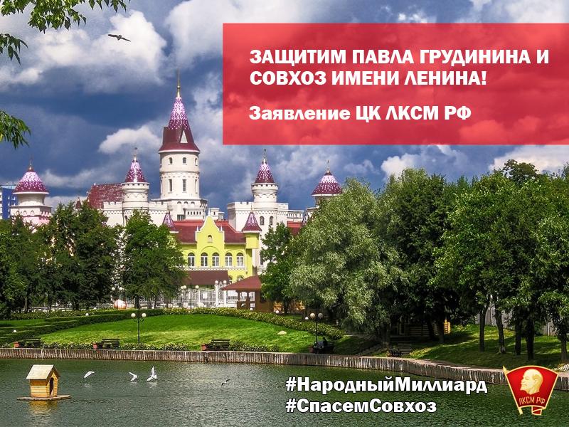 Сегодня мы, коммунисты и комсомольцы, говорим: мы не дадим уничтожить Совхоз имени Ленина! Вместе с миллионами граждан России коммунистическая молодёжь по всей стране присоединилась к акции #народныймиллиард, призванной собрать средства, необходимые для спасения совхоза. Объединив усилия, мы сможем отстоять уникальное народное предприятие и его руководителя - Павла Грудинина!