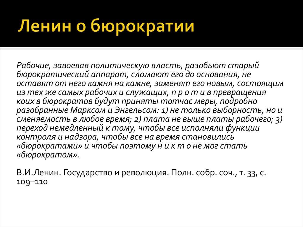 Однако надо признать, что эти особые привилегии (повышенные жалования, улучшенные жилищные условия, высокий уровень жизни и т.д.) распространялись исключительно только на мелкобуржуазную прослойку бюрократии и буржуазных учёных. Ленин, тем не менее, ясно видел опасность, порождаемую такими привилегиями для мелкобуржуазных элементов. Он понимал, что поощрение мелкобуржуазных специалистов высокой зарплатой может привести к соблазну установления такого же поощрения и в партийную среду, и в органы Советской власти. И тогда это перейдёт в мелкобуржуазную тенденцию превращения членов Советов в «парламентариев» или в бюрократов, а это уже приведёт к возникновению вместо буржуазной бюрократии другой, Советской бюрократии. В связи с чем Ленин не раз высказывал мысль: если что и погубит начатые революцией социальные преобразования в России, так это бюрократизм. И он призывал бороться с этим явлением.