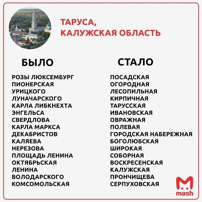 Поразительно, но именно с переименований начала свою работу городская дума Тарусы. К слову, депутатов от КПРФ там нет: 6 единороссов, 3 самовыдвиженца и член ЛДПР. Видимо, в их картине мира Таруса – это такой оазис благополучия, в котором осталась одна-единственная проблема – «неправильные» советские названия улиц.
